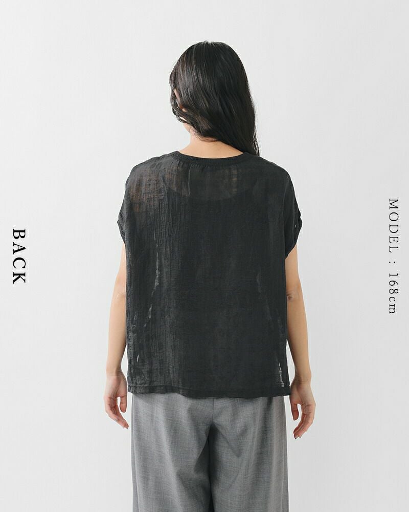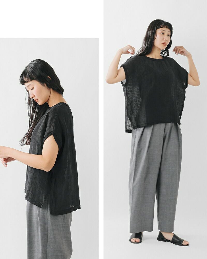 ゆるりとしたシルエットと上品な透け感の生地でリラックス感たっぷりのコーデに。