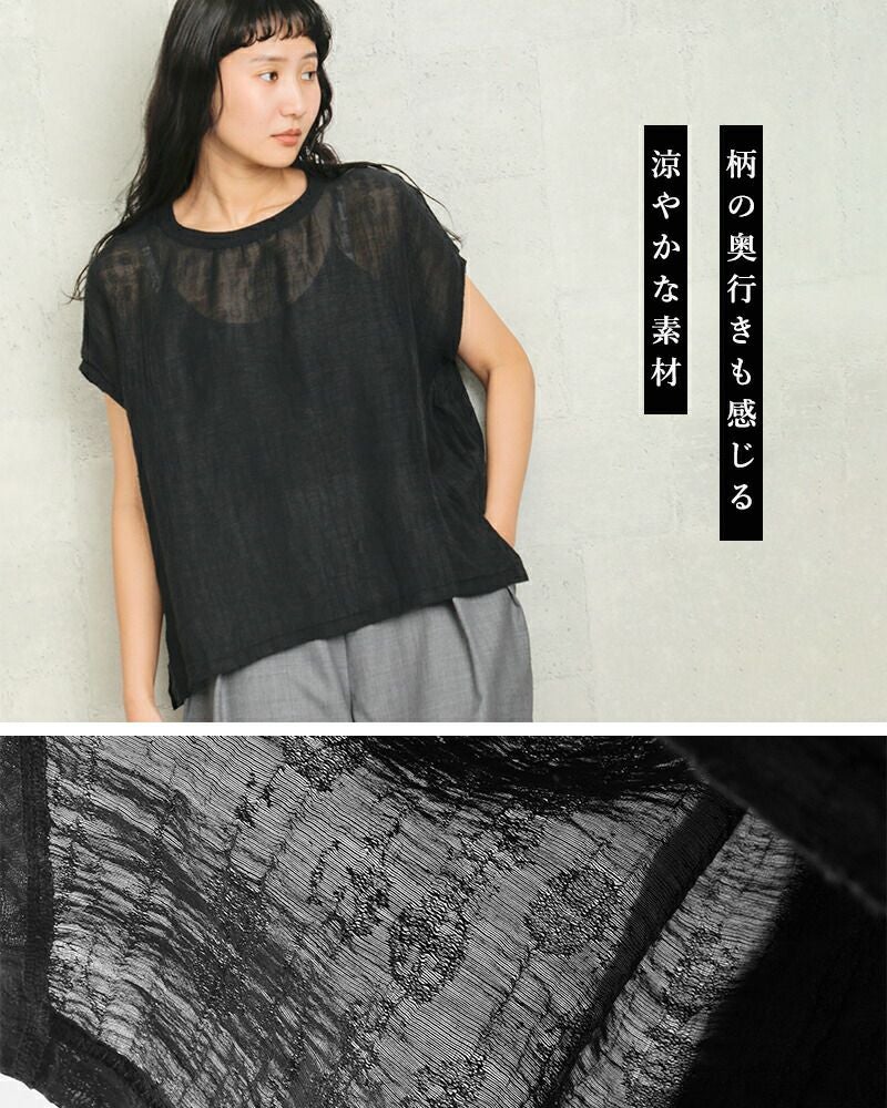上品なシアー感を楽しめる一枚。コンパクトな丈感がバランスのよいコーデが作りやすいデザイン。さりげないジャガードを引き立てるなら、ボトムスはシンプルなデザインがおすすめです。