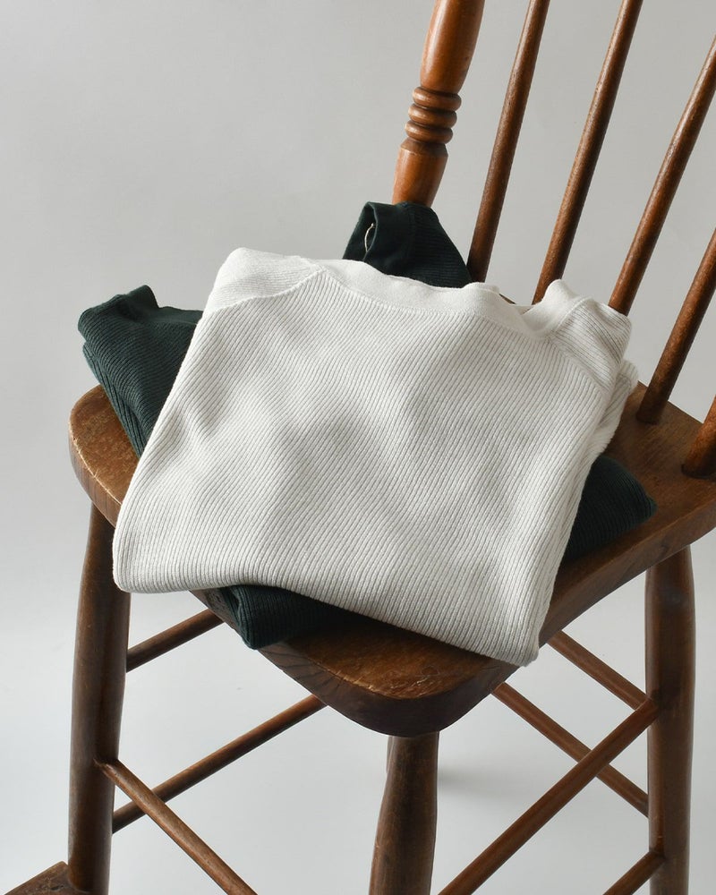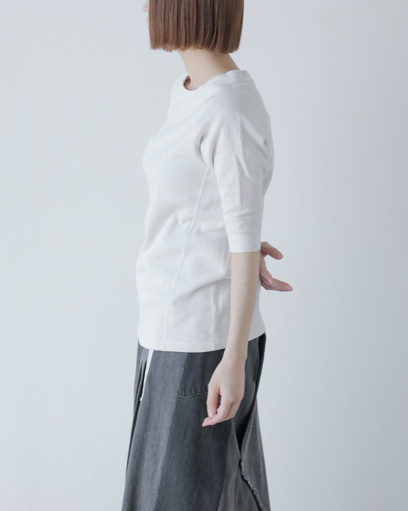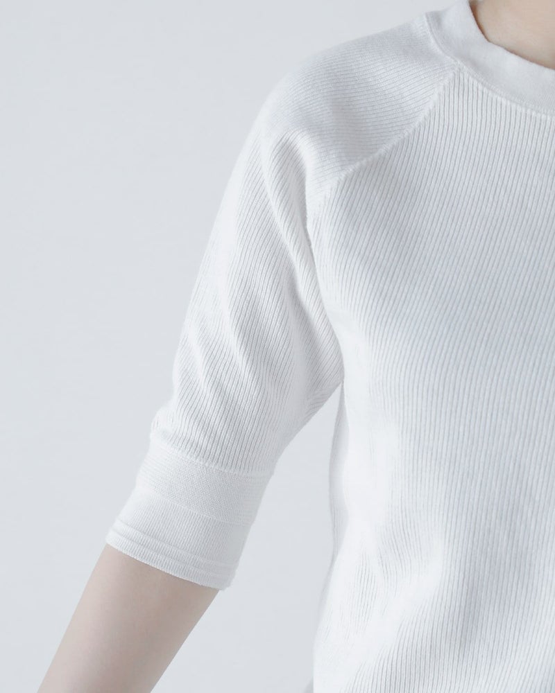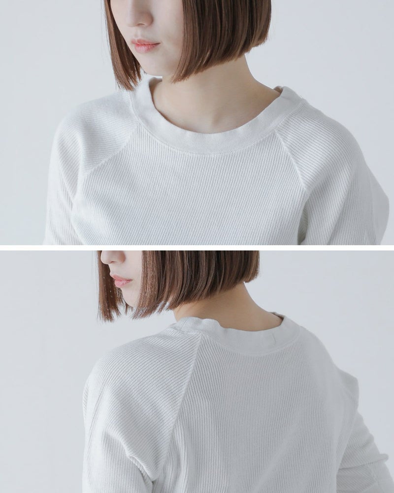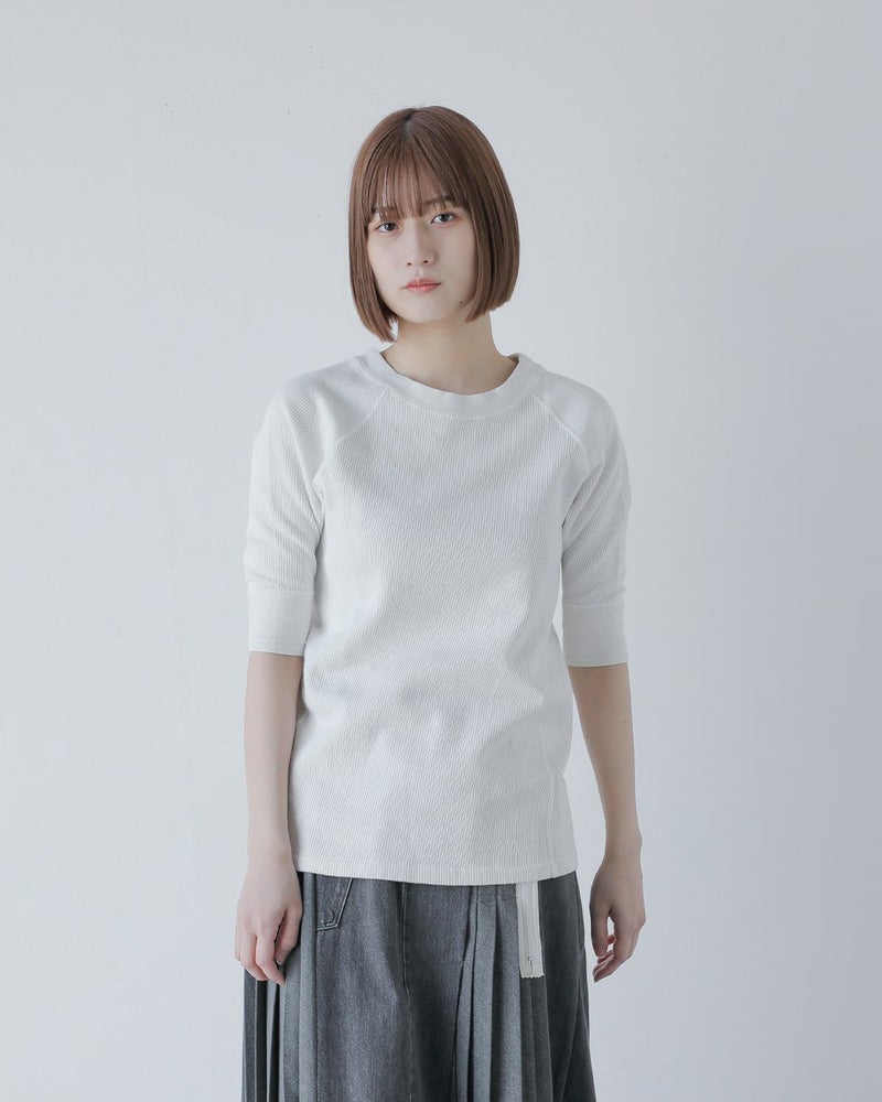 カジュアルになりすぎず、上品さを持ち合わせたアイテムです。特徴的なストライプジャガード生地は、シンプルながらも豊かな表情感を演出し、一枚で着ても、重ね着のインナーとしても活躍します。長めの袖丈と着丈が、トレンドを感じさせると同時に、全体的にバランスの取れたシルエットを提供。ラグランスリーブや広めのクルーネックにより、着心地はもちろん、動きやすさも抜群です。