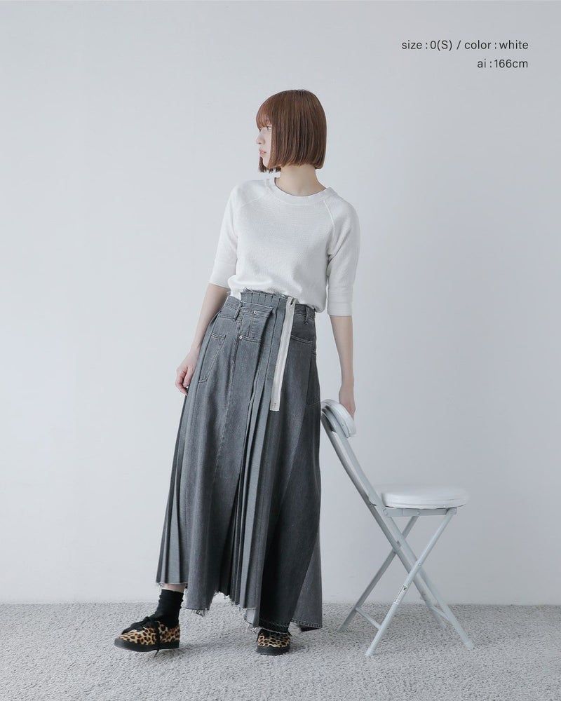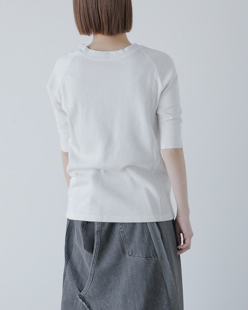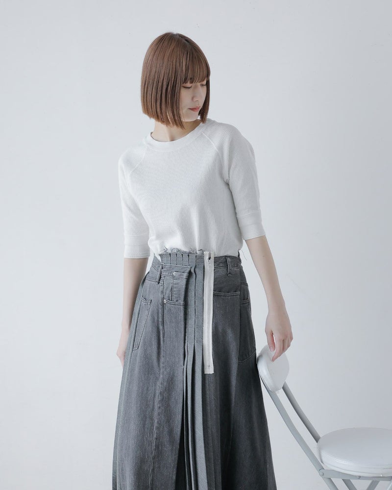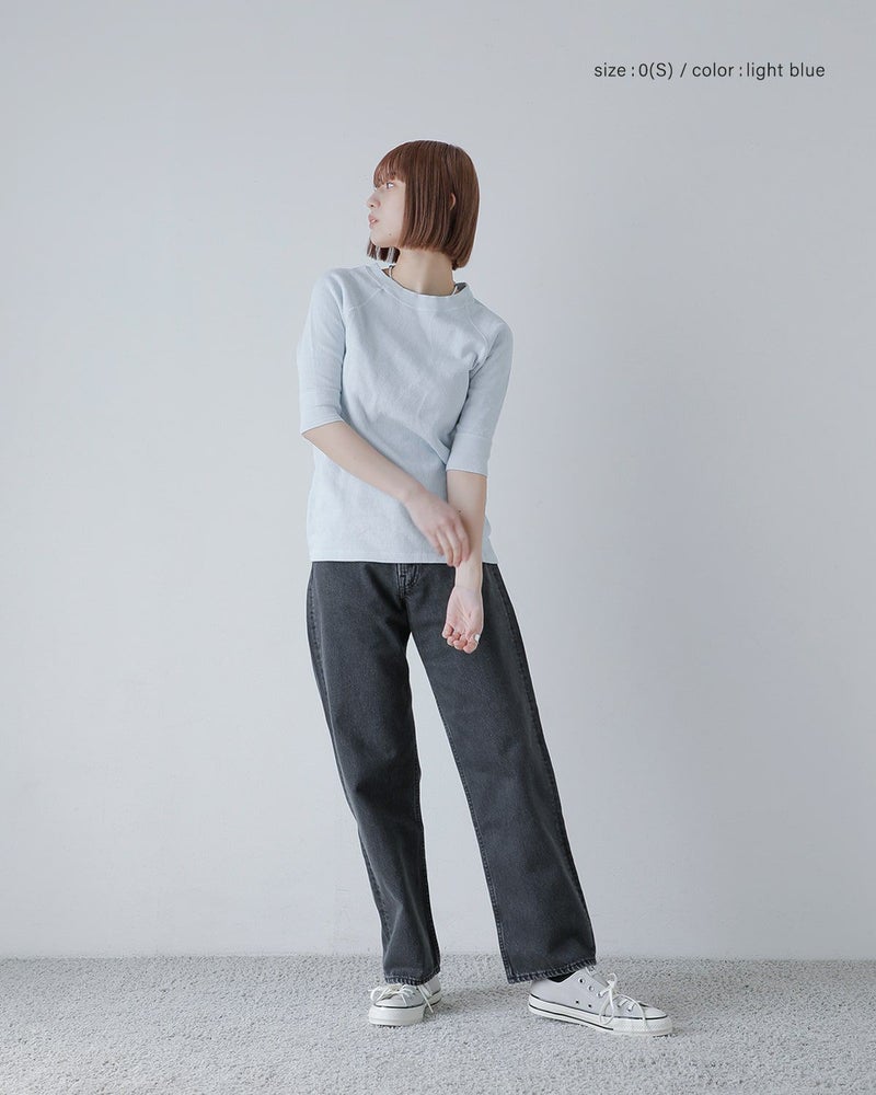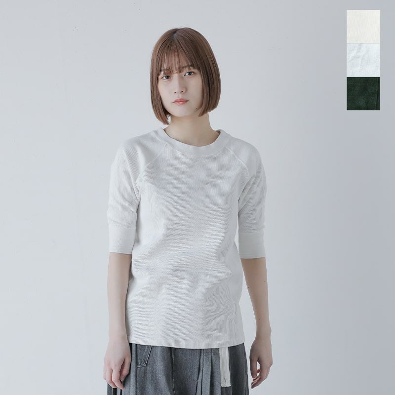 カジュアルになりすぎず、上品さを持ち合わせたアイテムです。特徴的なストライプジャガード生地は、シンプルながらも豊かな表情感を演出し、一枚で着ても、重ね着のインナーとしても活躍します。長めの袖丈と着丈が、トレンドを感じさせると同時に、全体的にバランスの取れたシルエットを提供。ラグランスリーブや広めのクルーネックにより、着心地はもちろん、動きやすさも抜群です。