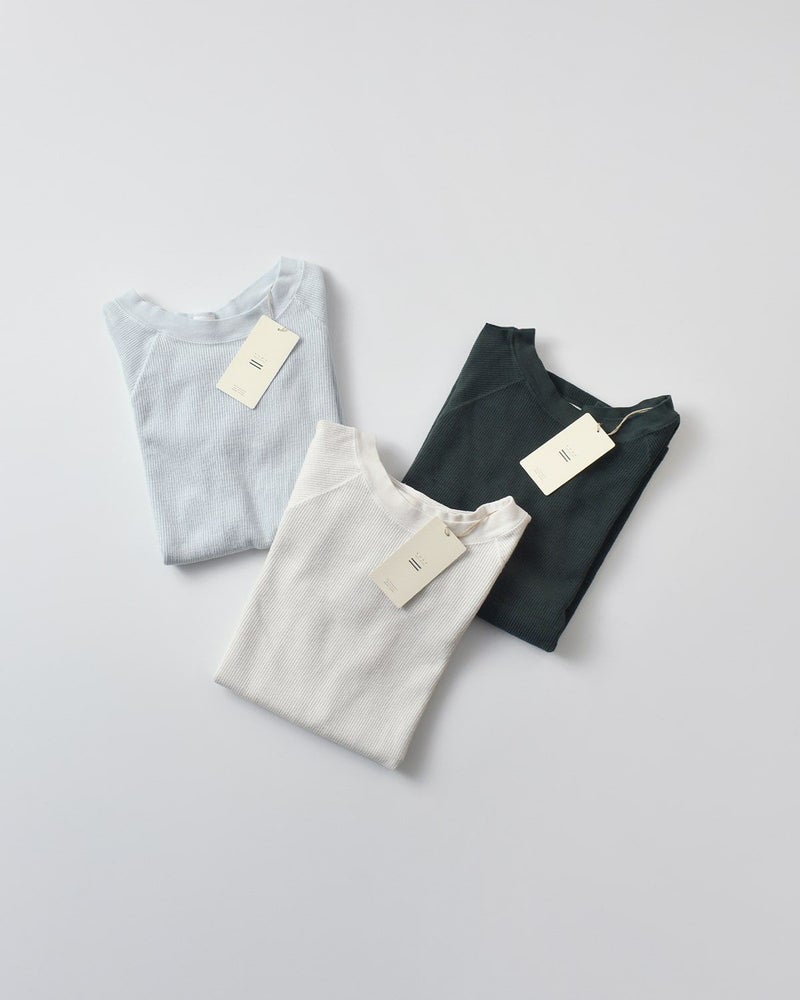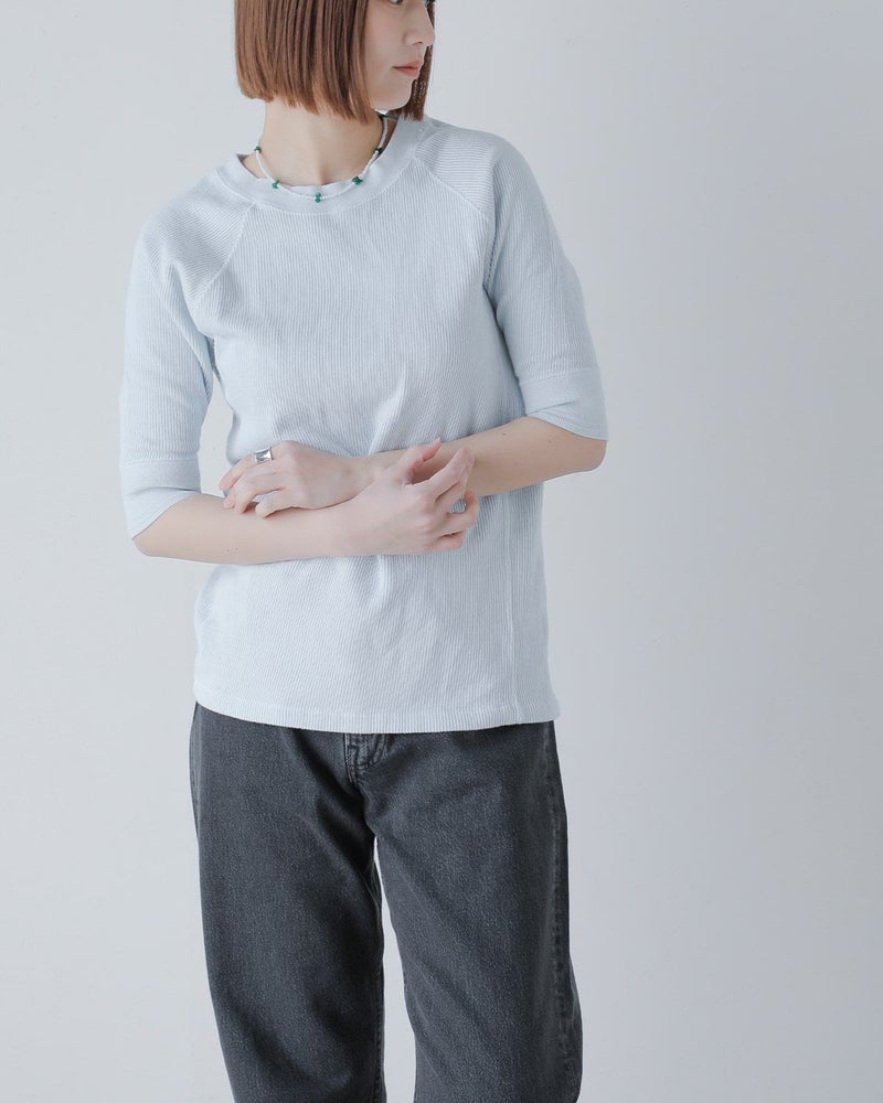 ストライプジャガード生地は、表情感を持たせるために織り方に工夫が施されています。しっかりとした厚みがありつつも、軽やかで柔らかな触感。通気性が良く、季節を問わず着やすい素材です。シンプルなデザインに加え、この生地が独特の風合いを生み出し、無地のTシャツにはない高級感を感じさせます。