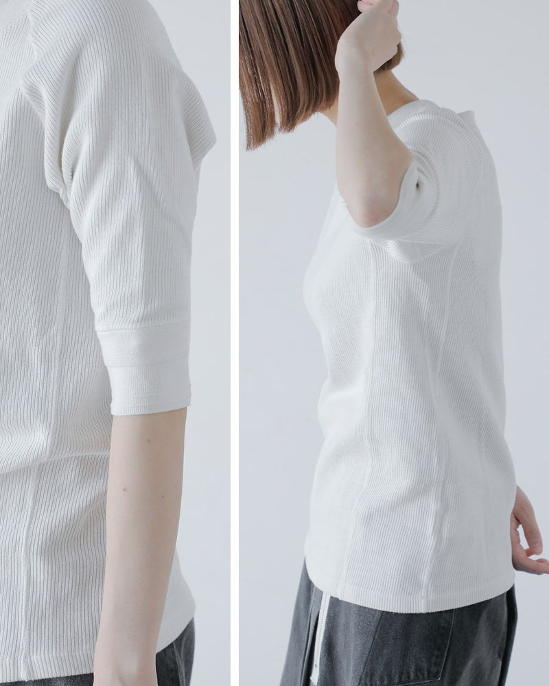 広めのクルーネックデザインで、シンプルかつ清潔感のある印象を与えます。開き具合も程よく、窮屈感なく着用できます。