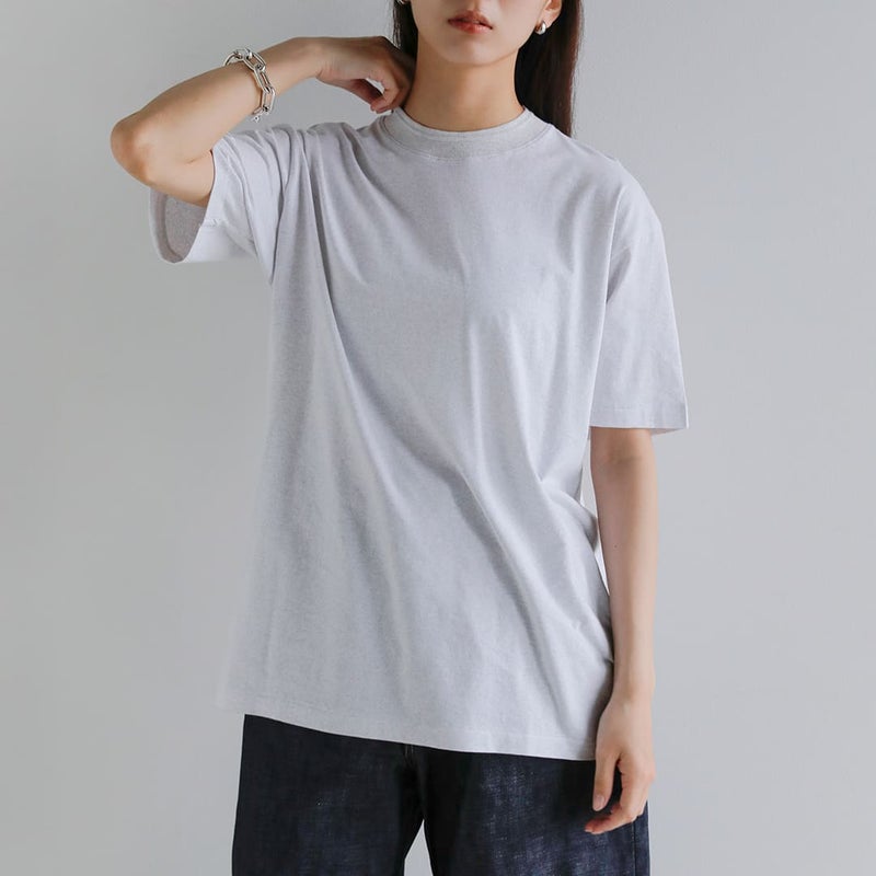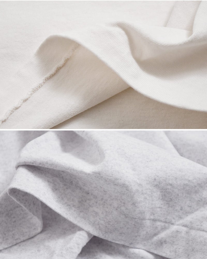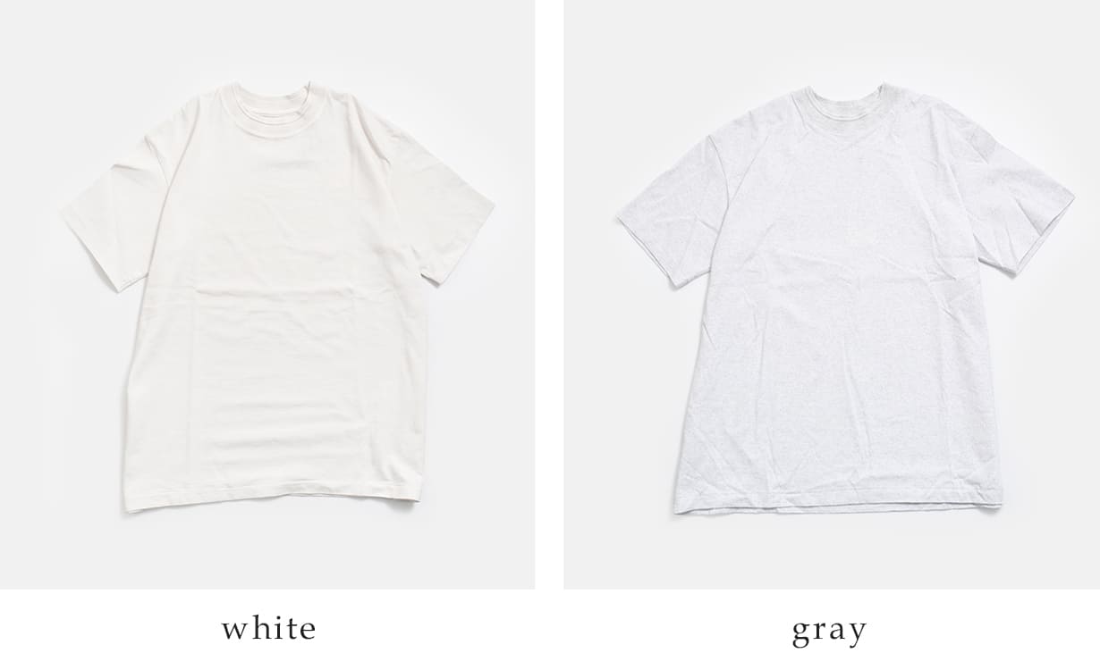 WHITEは白染め加工を施すことで、単なる無加工の白とは異なり、わずかな陰影と奥行きを感じる表情に。GREYは洗い加工により、柔らかく身体に馴染む風合いと、霜降り特有のムラや陰影を持たせています。着用と洗いを重ねることで、さらに生地が馴染み、経年変化も楽しめます。