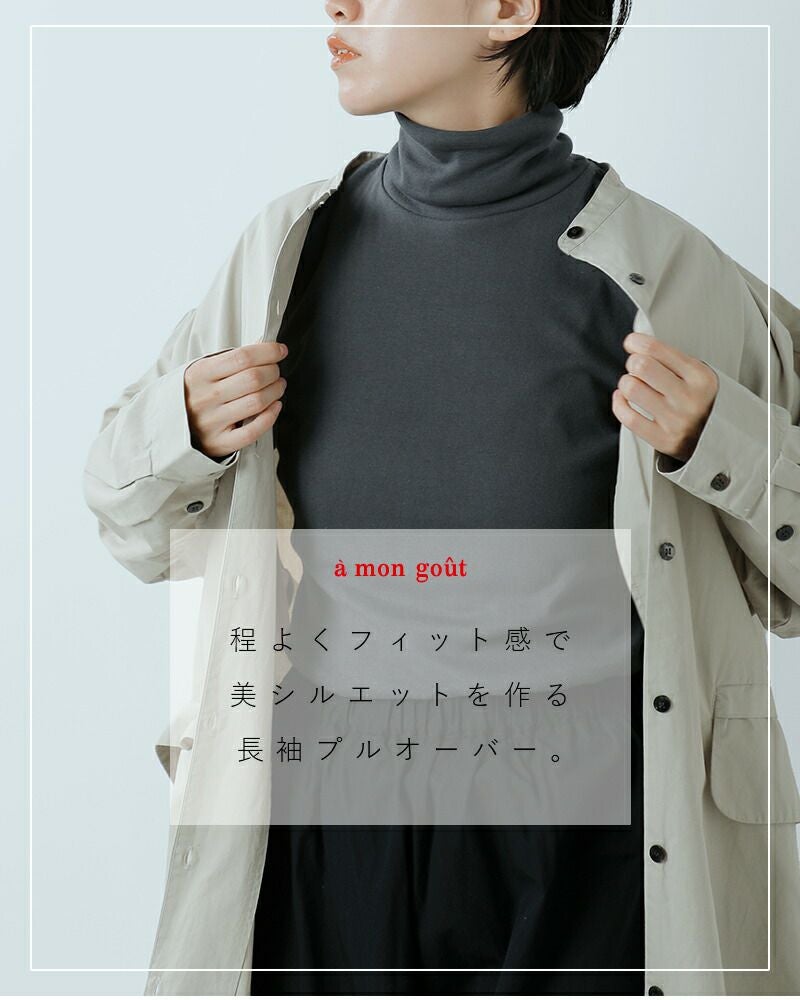 a mon gout(アモング)よりコットンシュクレフライスタートルネック長袖プルオーバーのご紹介です。程よくフィット感があり、体のラインを美しく見せるシルエットが魅力のプルオーバー。高さがあるタートルネックなので、一枚で着てもとても様になります。伸縮性にも優れているので、ストレスフリーな着心地。重ね着も便利なので色違いで欲しくなってしまいます♪