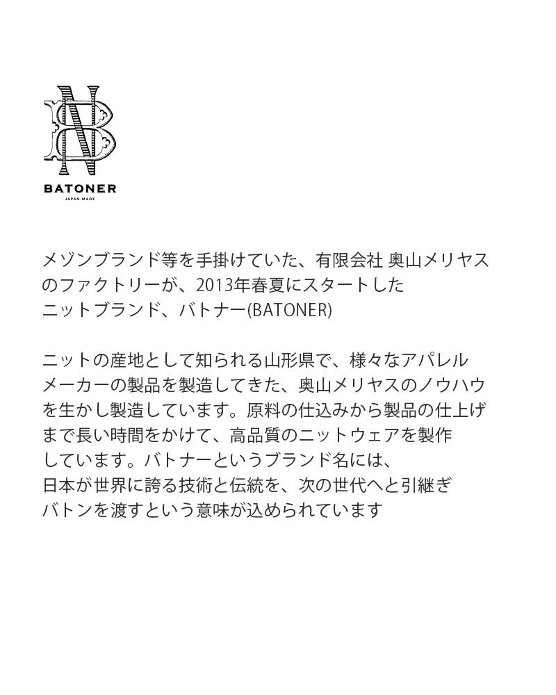メゾンブランド等を手掛けていた、有限会社 奥山メリヤスのファクトリーが、2013年春夏にスタートしたニットブランド、バトナー(BATONER)ニットの産地として知られる山形県で、様々なアパレルメーカーの製品を製造してきた、奥山メリヤスのノウハウを生かし製造しています。原料の仕込みから製品の仕上げまで長い時間をかけて、高品質のニットウェアを製作しています。バトナーというブランド名には、日本が世界に誇る技術と伝統を、次の世代へと引継ぎバトンを渡すという意味が込められています