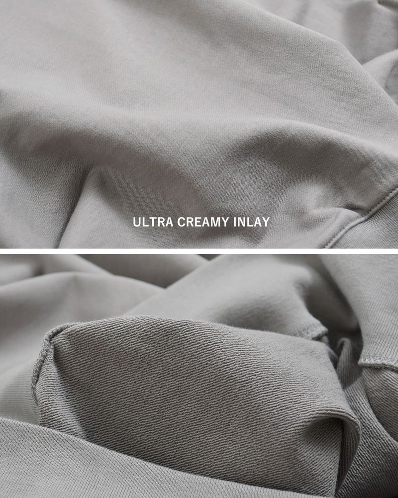 スウェットよりも薄くて軽やかで、肌に吸い付くように心地良いウルトラクリーミーインレイ。ほんのりと上品な光沢があり、新しい印象の裏毛素材です。天然の油分を豊富に含み、柔らかさと上品な光沢を併せ持つ細番手のスヴィンコットンを使用。超ハイゲージの編機で極限まで薄く編み立てたバトナー独自の特殊裏毛シリーズです。