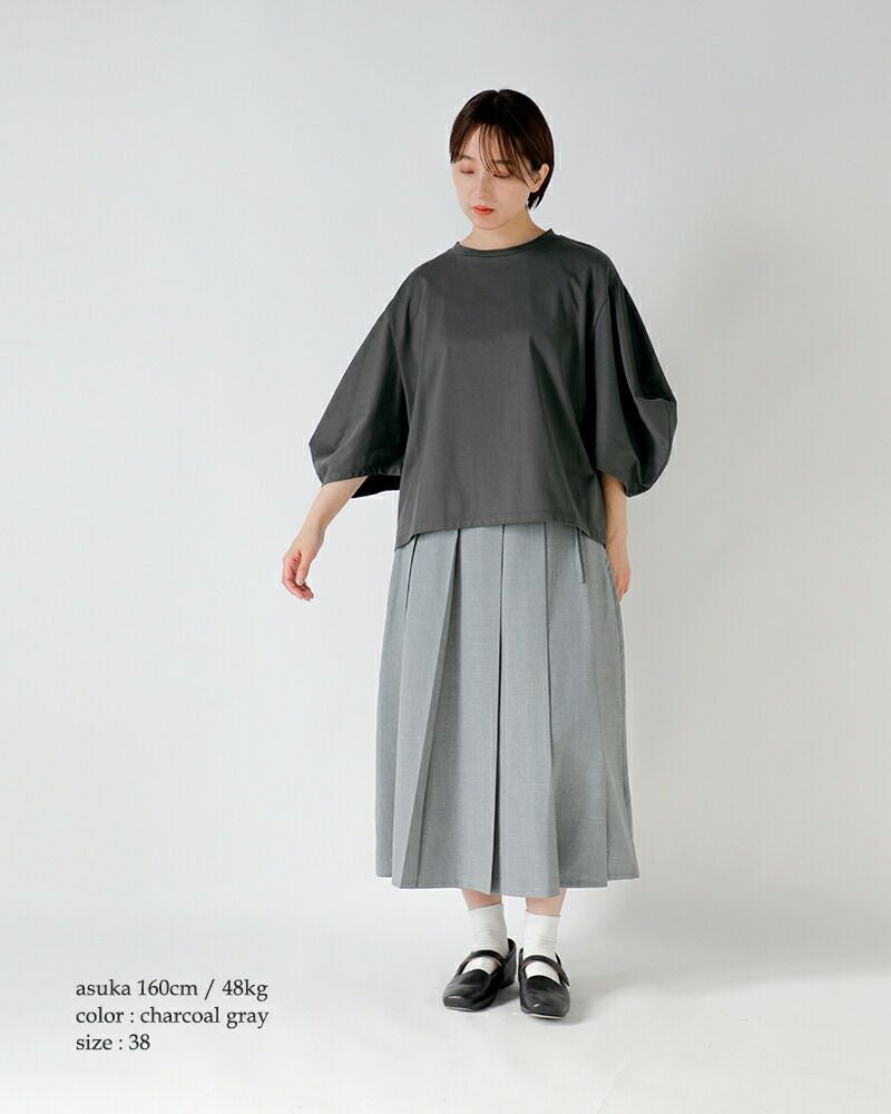 身頃は適度にゆとりを持たせ、身体のラインを拾いすぎない安心のシルエット。着丈もバランスよく整えられており、パンツ・スカートどちらとも相性のいい万能な一枚です。