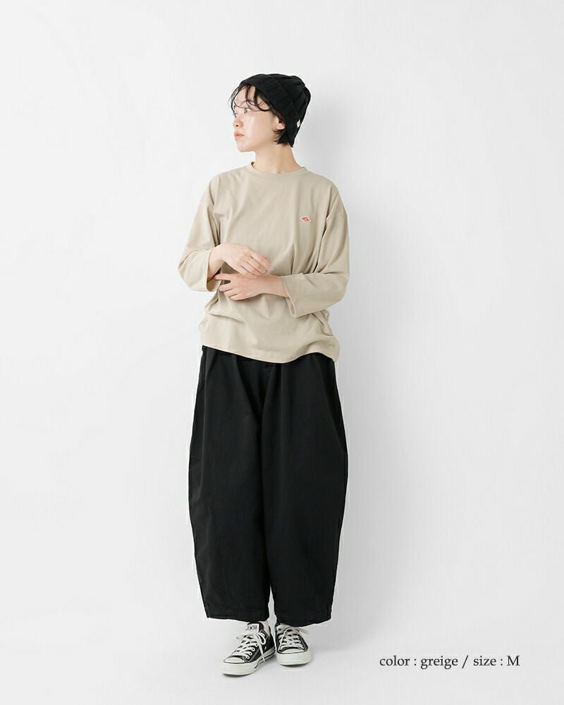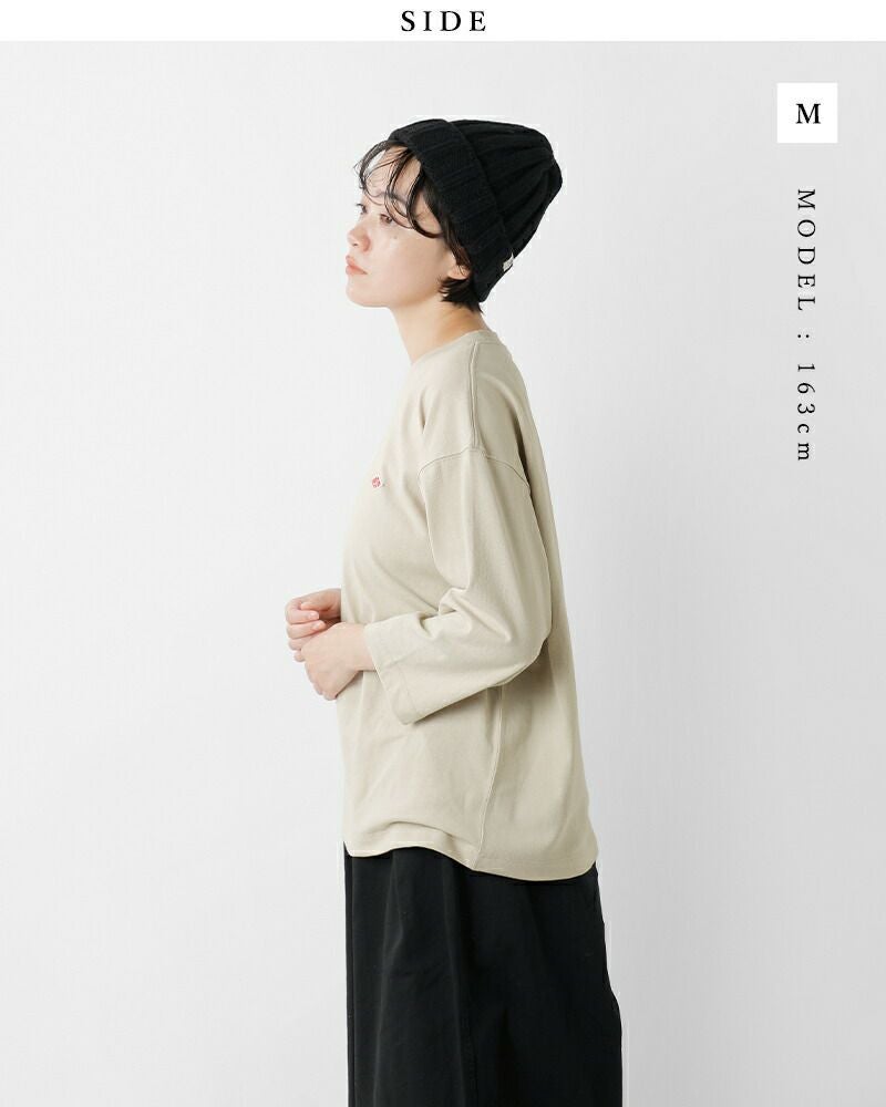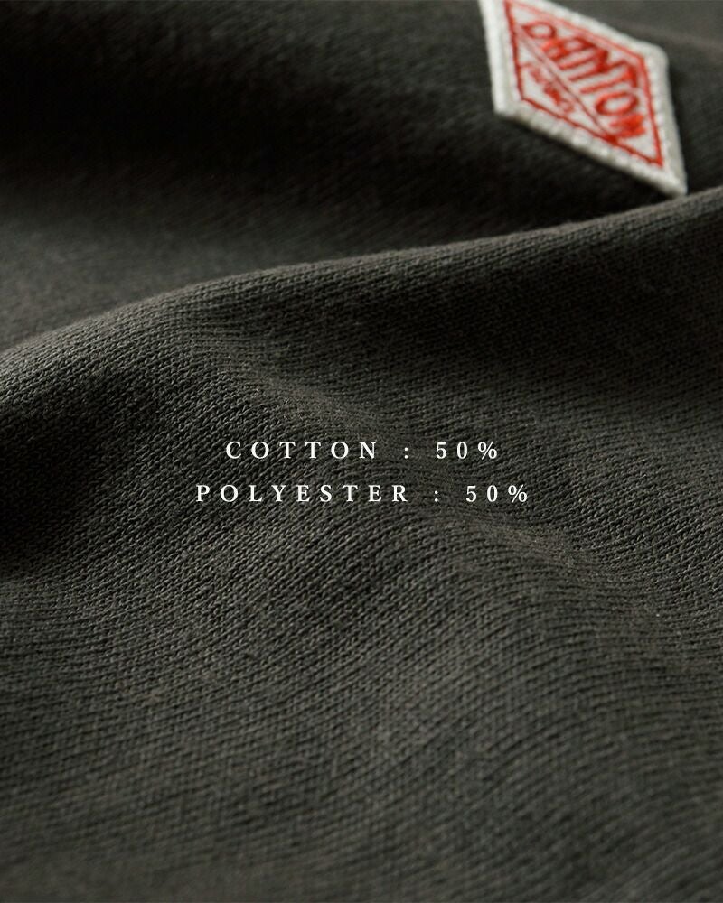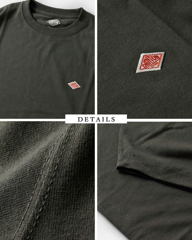 胸元にはダントンといえばのワンポイントロゴワッペンを配しています。丁寧に縫製されたダブルステッチのディテールにも注目。リブ編みなどのないプレーンな袖口でリラックス感のあるスタイルに仕上がります。