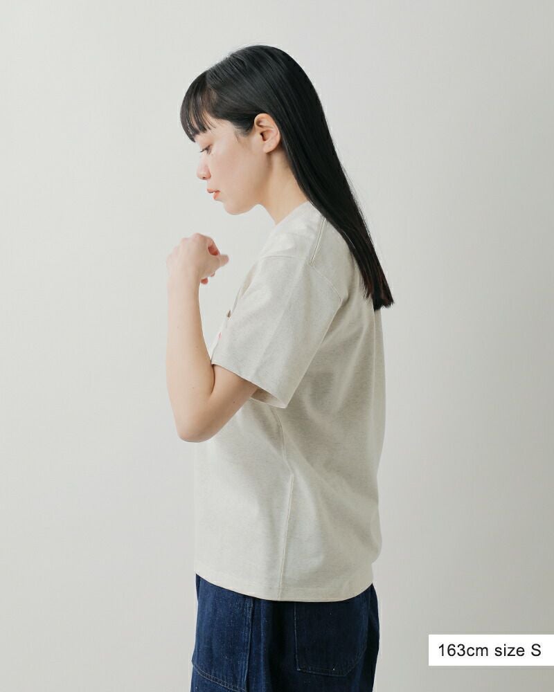 さらりと肌なじみのよいコットン素材のやさしいタッチ感はそのままに、ポリエステルの軽さと機能性を兼ねそなえた混紡素材を使用しています。きゅっと目が詰まってカジュアルさの中にも上品な雰囲気が感じられ、大人のデイリーユースにふさわしい素材感をお楽しみいただけます。cotton 50% polyester 50%