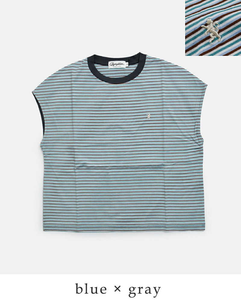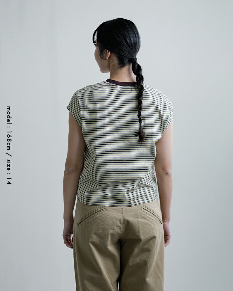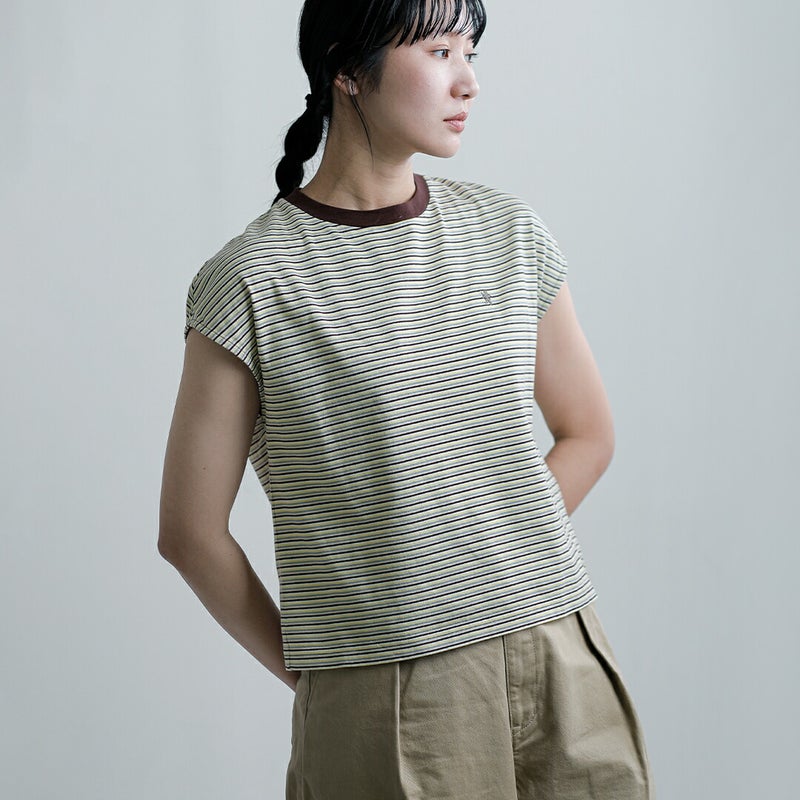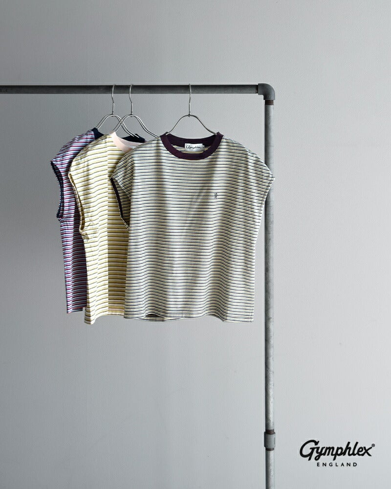 Gymphlex(ジムフレックス)より、コットン マルチボーダー Tシャツをご紹介します。Gymphlexオリジナルのマルチボーダーが目を惹く素材。インナーが見えづらいようにアームホールを細かく調整し、着用の際には腕が綺麗に見えるように裏からバイヤステープをあてています。6~7色の糸を細ピッチのマルチボーダーにした素材で、通常工程で入るシルケット加工をなくし、製品で洗いをかけることでよりナチュラルな雰囲気に仕上げました。