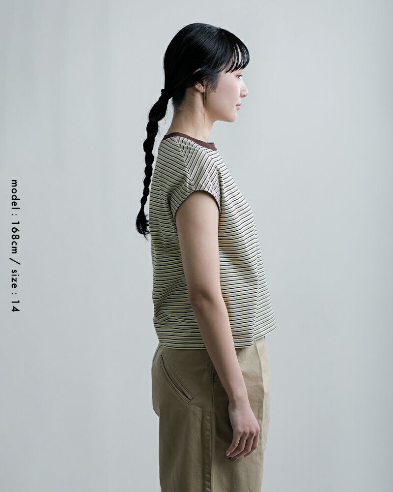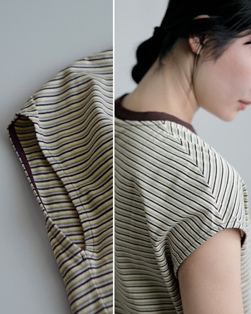 ●コットン 100%6~7色の糸を細ピッチのマルチボーダーにした素材で、通常工程で入るシルケット加工をなくし、製品で洗いをかけることでよりナチュラルな雰囲気に仕上げました。