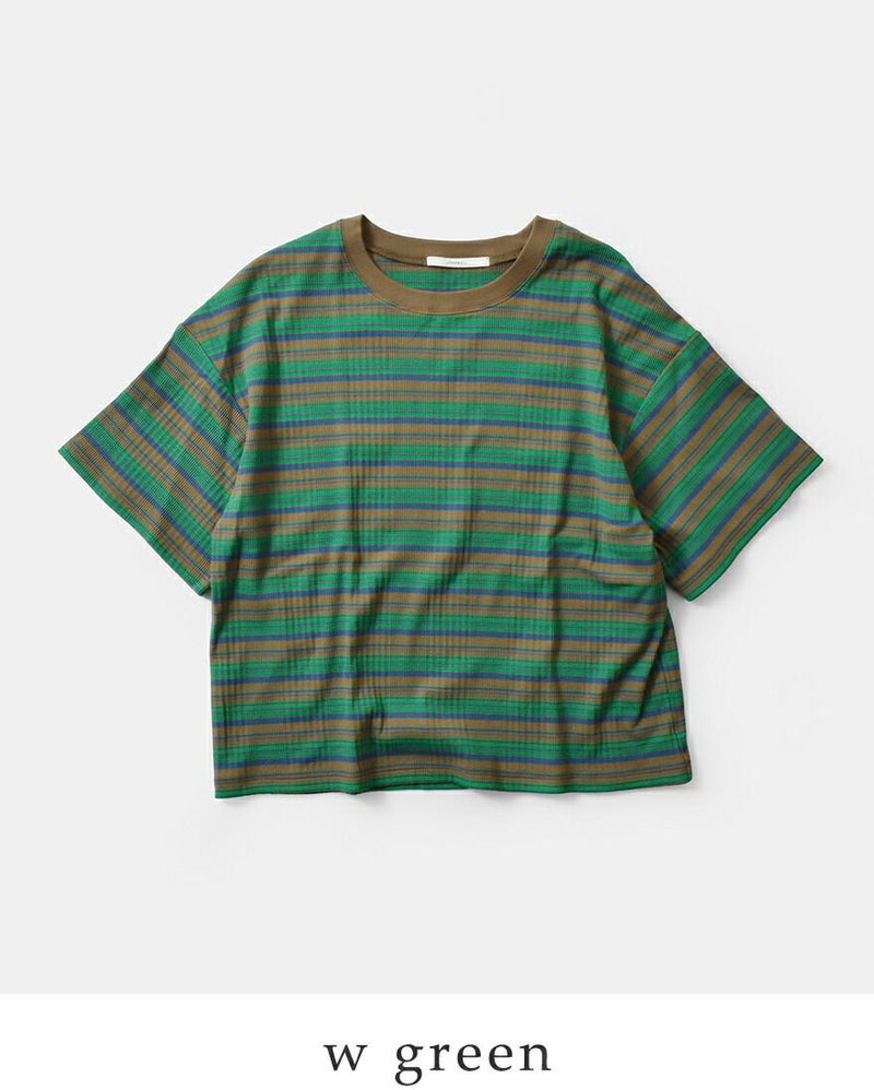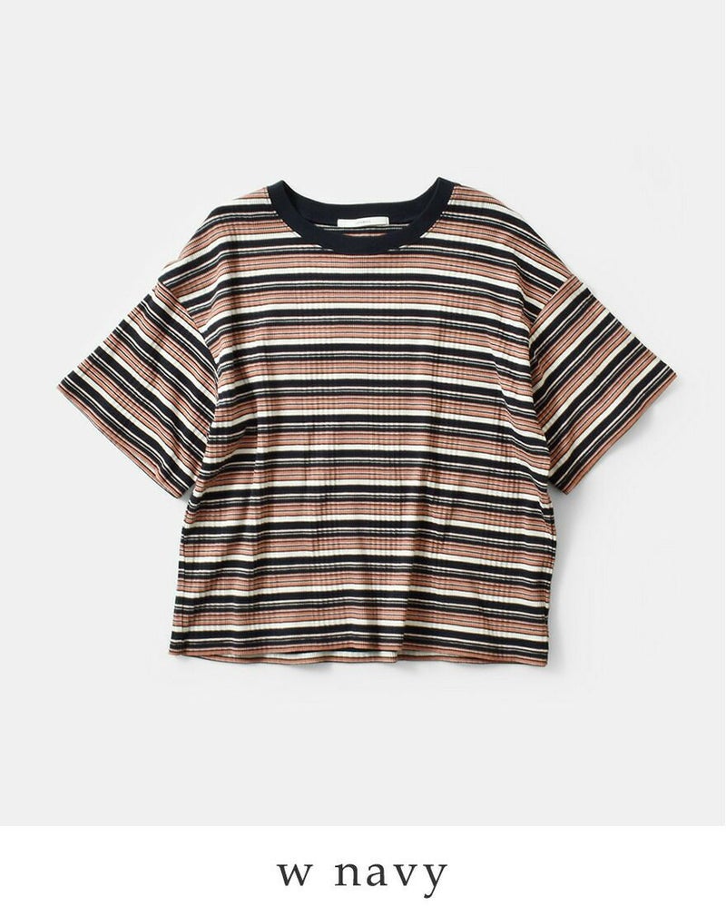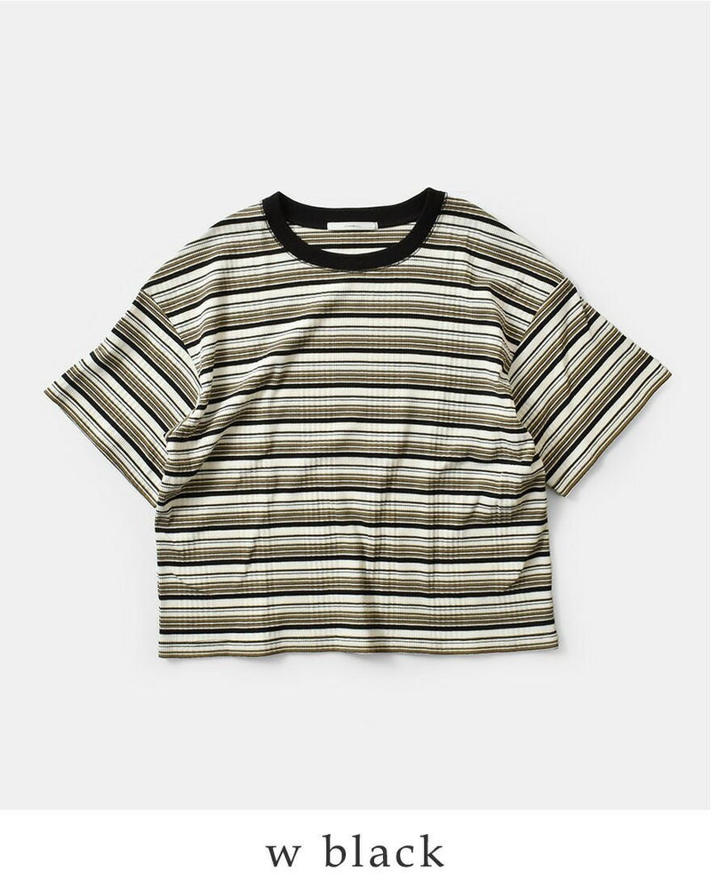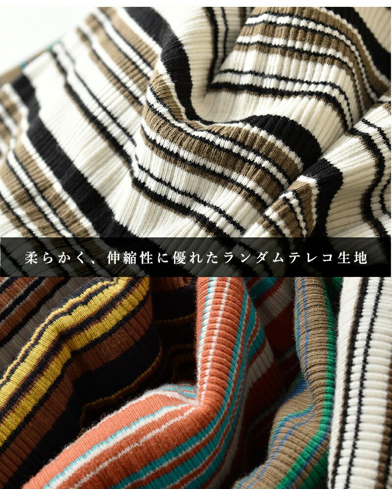 オリジナルのランダムテレコ生地を使用しています。伸びが良く、程よいフィット感が魅力で快適な着心地です。ランダムピッチのボーダーが立体感と奥行きを生み、快適な着心地と表情豊かな素材感を両立しています