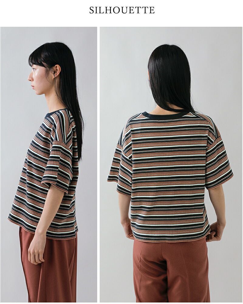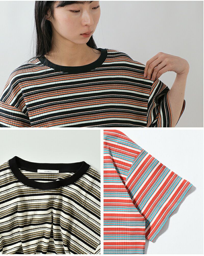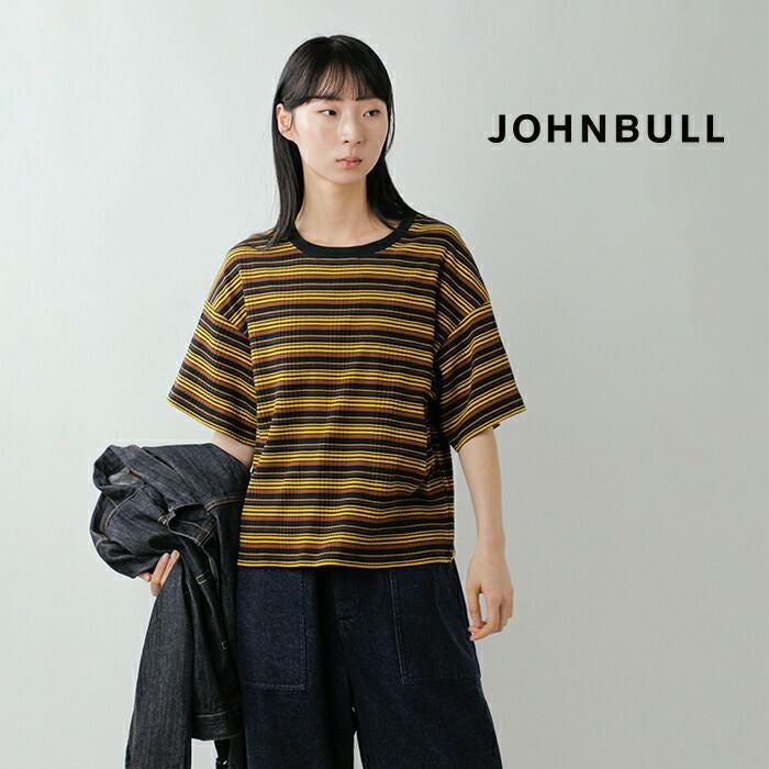 Johnbull(ジョンブル)より、コットンランダムテレコ ボックスTシャツをご紹介します。ランダムピッチのボーダー柄が印象的な、表情豊かなテレコ素材のTシャツです。柔らかく伸縮性に優れたコットンテレコ生地を使用しており、肌当たりが良く、快適な着心地が魅力。程よくゆとりを持たせたボックスシルエットで、体のラインを拾いにくく、1枚でも様になるデザインです。レトロな配色のボーダーがコーディネートのアクセントになります。