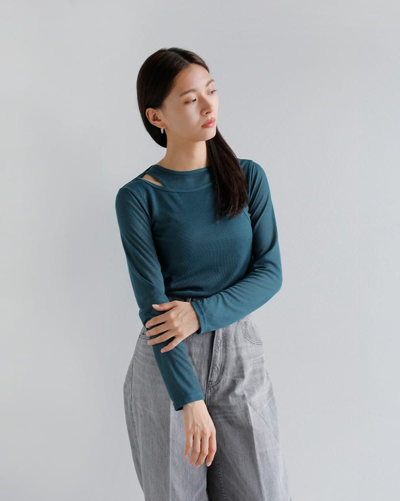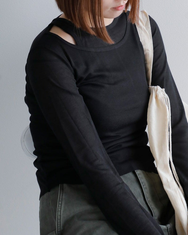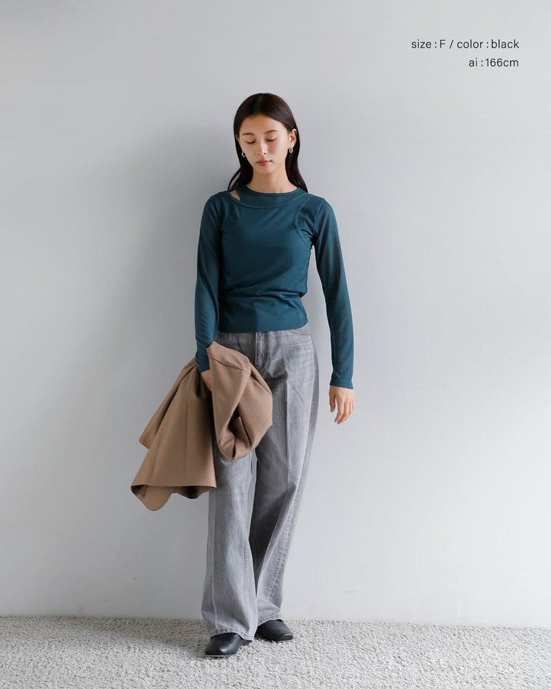 肩の開きがデザインのアクセントとなり、モダンで洗練された印象に。薄手ながらも伸縮性があり、タイトなフィット感でも快適に着用できる1枚です。カジュアルにも、ちょっとしたお出かけにもピッタリなアイテムです。どんなシーンでもサラッと着こなせ、コーディネートの幅を広げます。