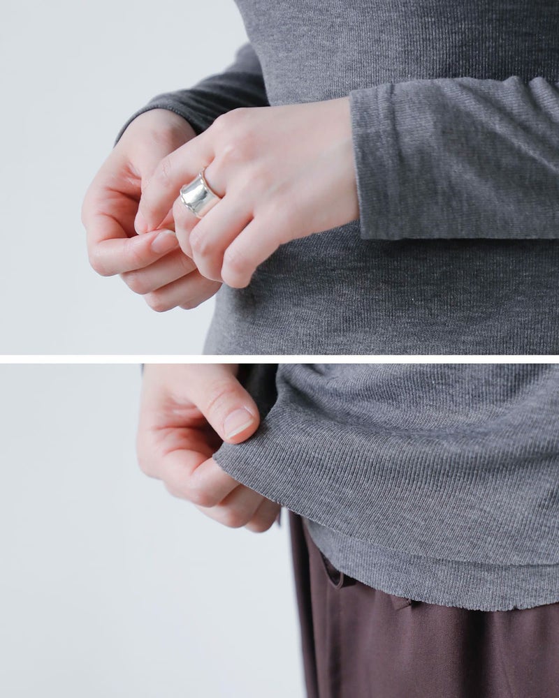 軽やかなリブ素材で、涼しげでありながら、しっかりとした伸縮性を持っています。柔らかく、肌に優しい触り心地で、長時間着ても快適さを感じることができます。また、通気性が良く、季節を問わず着用可能。透け感のあるシアーが美しく、着るだけで女性らしい魅力を引き立てます。