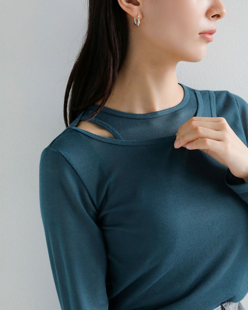 シアー素材を活かしたレイヤードデザインのタンクトップです。程よく透け感のある素材がヘルシーでありながら、モードな雰囲気を醸し出します。細いリブ編みが体のラインをきれいに引き立て、着る人の美しいシルエットを作り出します。