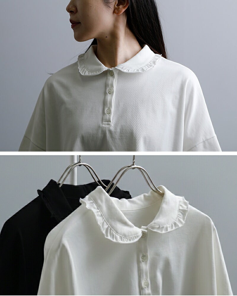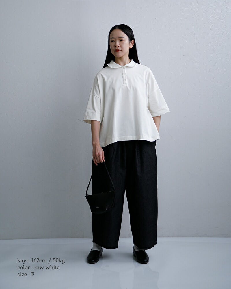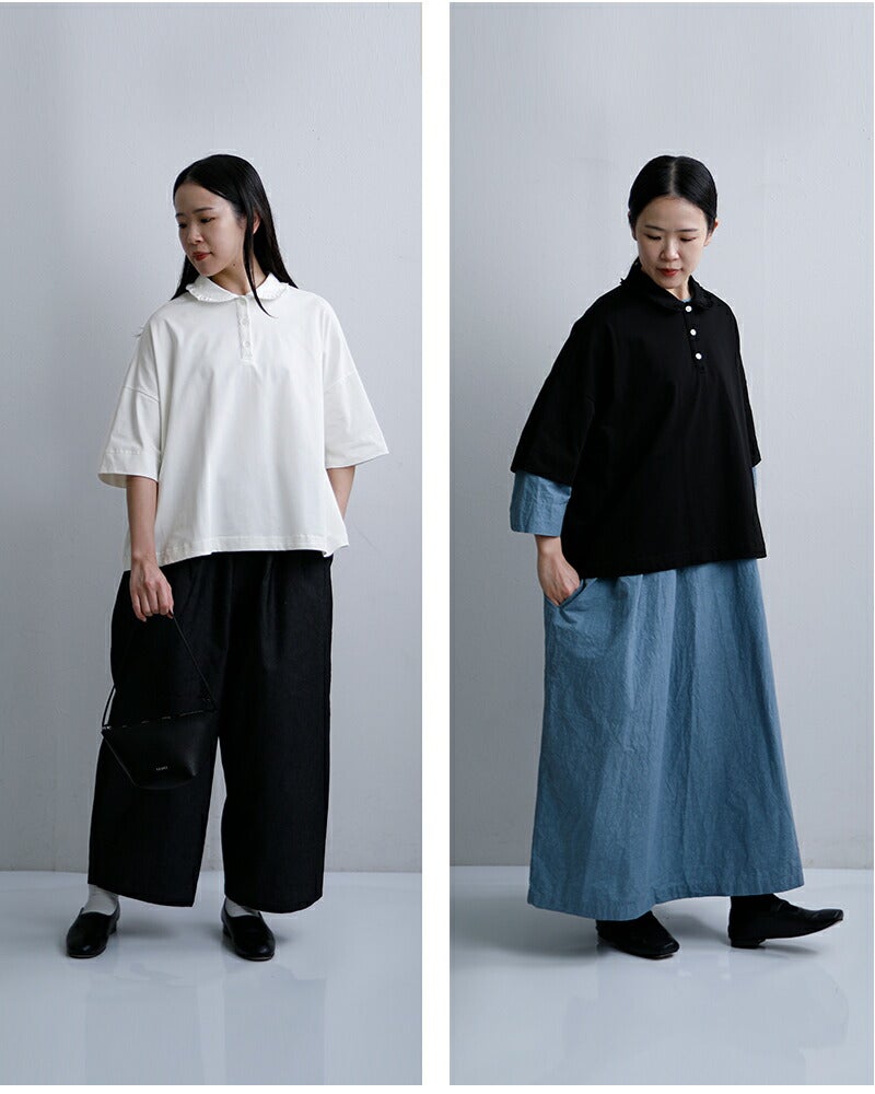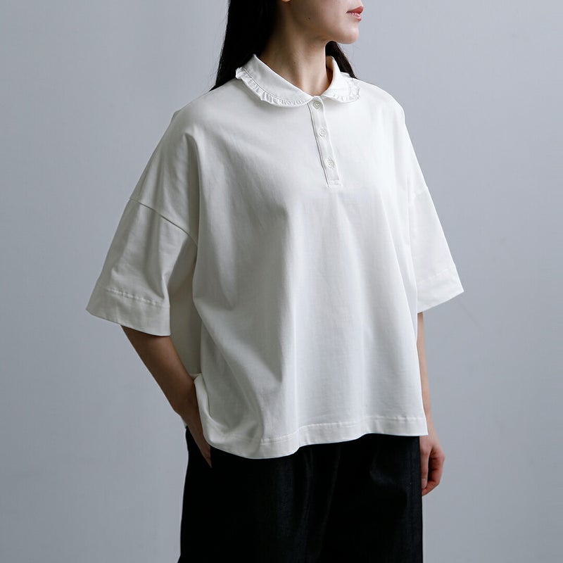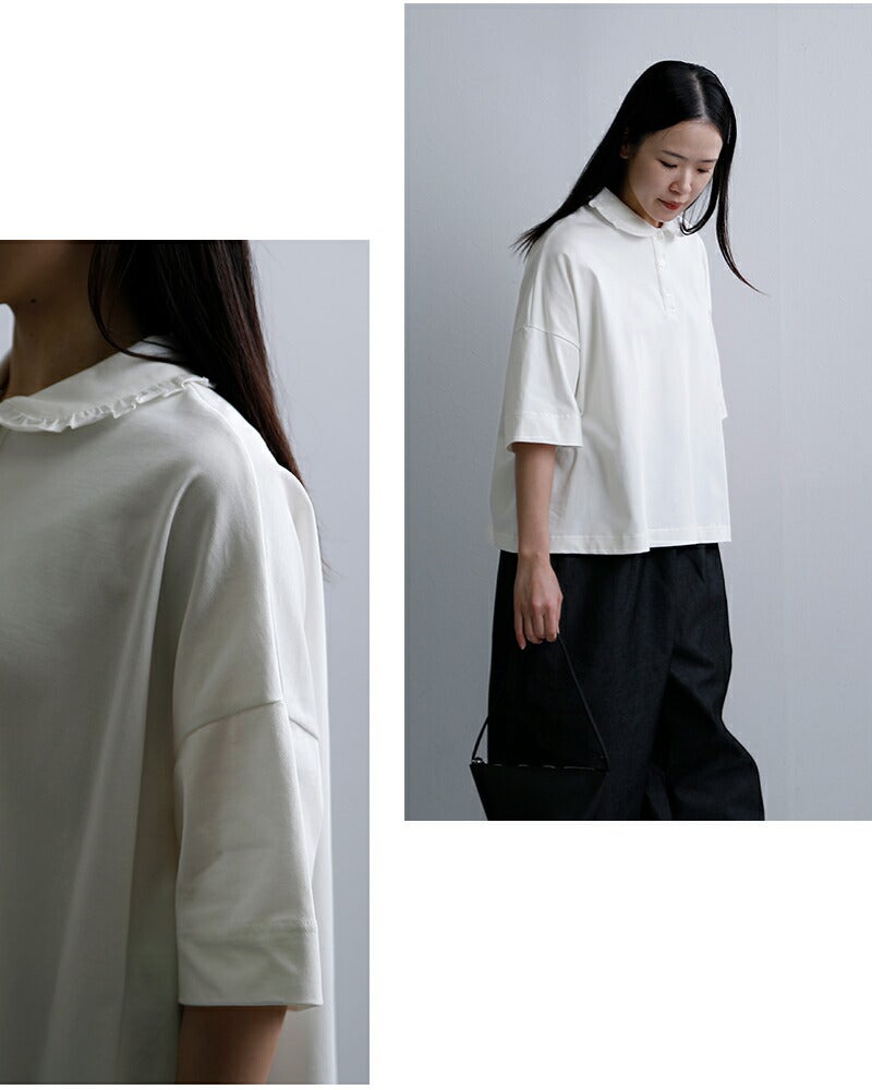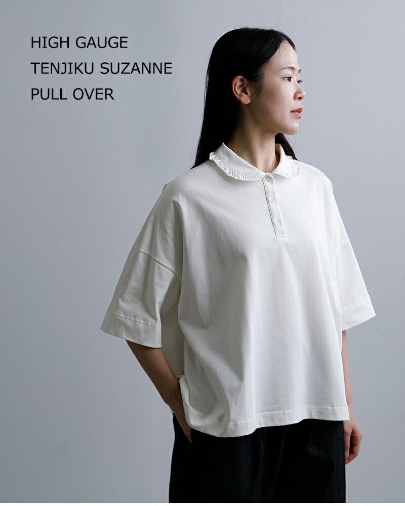 Laboratory(ラボレイトリー)より、コットンハイゲージ天竺 スザンヌ プルオーバー “HIGH GAUGE TENJIKU SUZANNE PULL OVER ”をご紹介します。 滑らかな表面感が魅力の、コットンハイゲージ天竺素材を使用したプルオーバー。 上質なカットソーならではの品のある風合いで、カジュアルながらも大人らしい佇まいに仕上がっています。 程よくゆとりを持たせたボックスシルエットに、肘にかかる五分袖。 首元は小ぶりなフリル襟と前立てデザインがアクセントとなり、さりげなく女性らしさを添えます。 一枚ではもちろん、ボトムスを選ばず幅広いスタイリングに活躍。 デイリーからきれいめな着こなしまで、長く愛用いただける一着です。