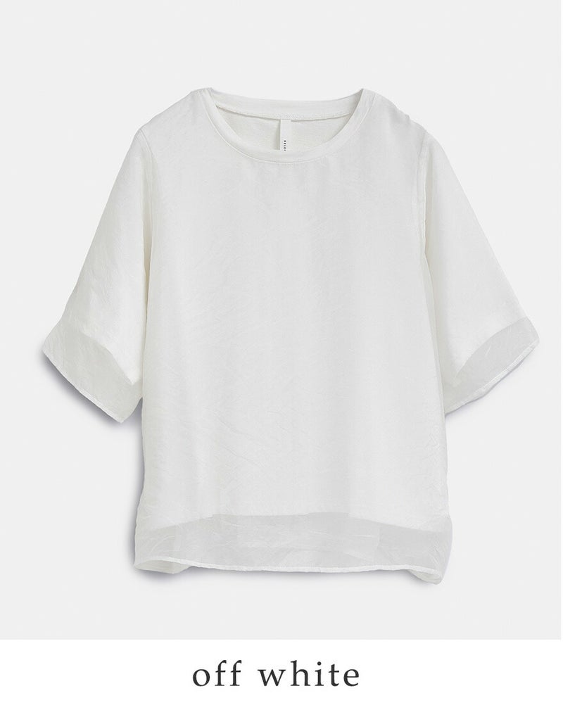 カットソーよりもオーガンジー素材の袖丈・着丈を長く設定して、軽やかな透け感を印象付けます。ゆったりとした身幅と、肘が隠れる長さの袖丈で、体型カバー効果があり、安心して着ていただけます。