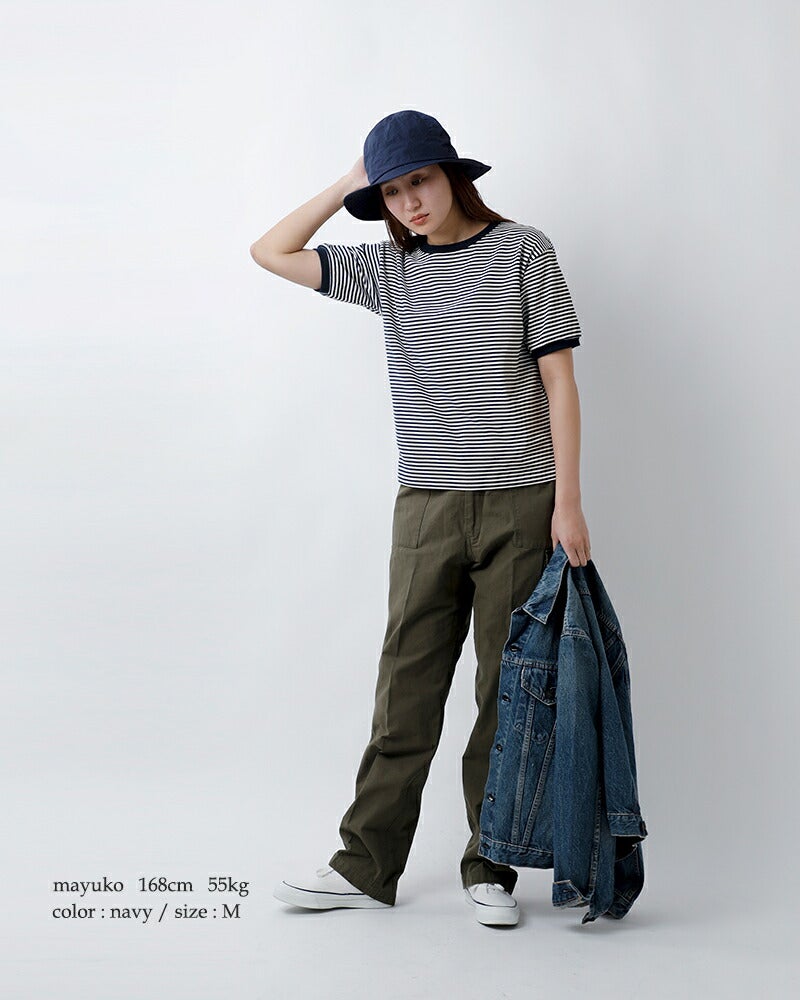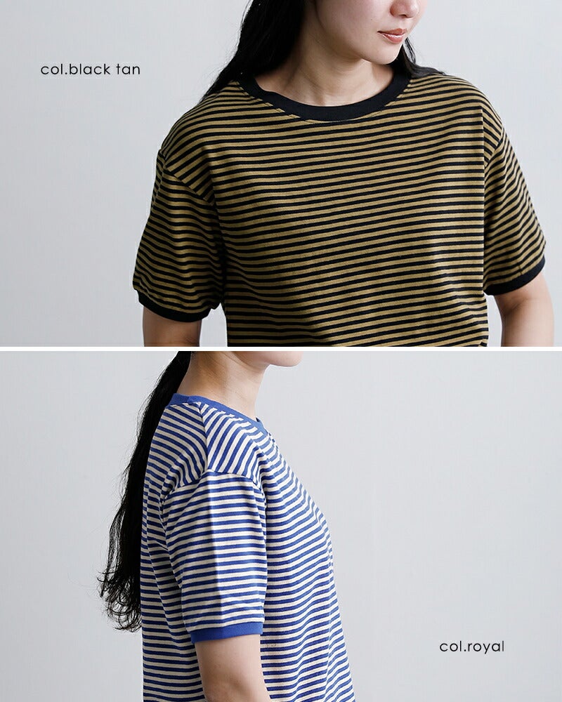 カジュアルな印象が強いリンガーTシャツを、細身のボーダー柄にすることで女性らしく洗練された雰囲気に仕上げました。ネックラインと袖口に配された配色のリブが、コーディネート全体を程よく引き締め、ミニマルながらも存在感のある一着です。