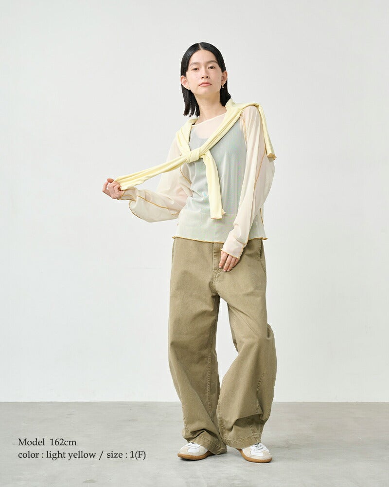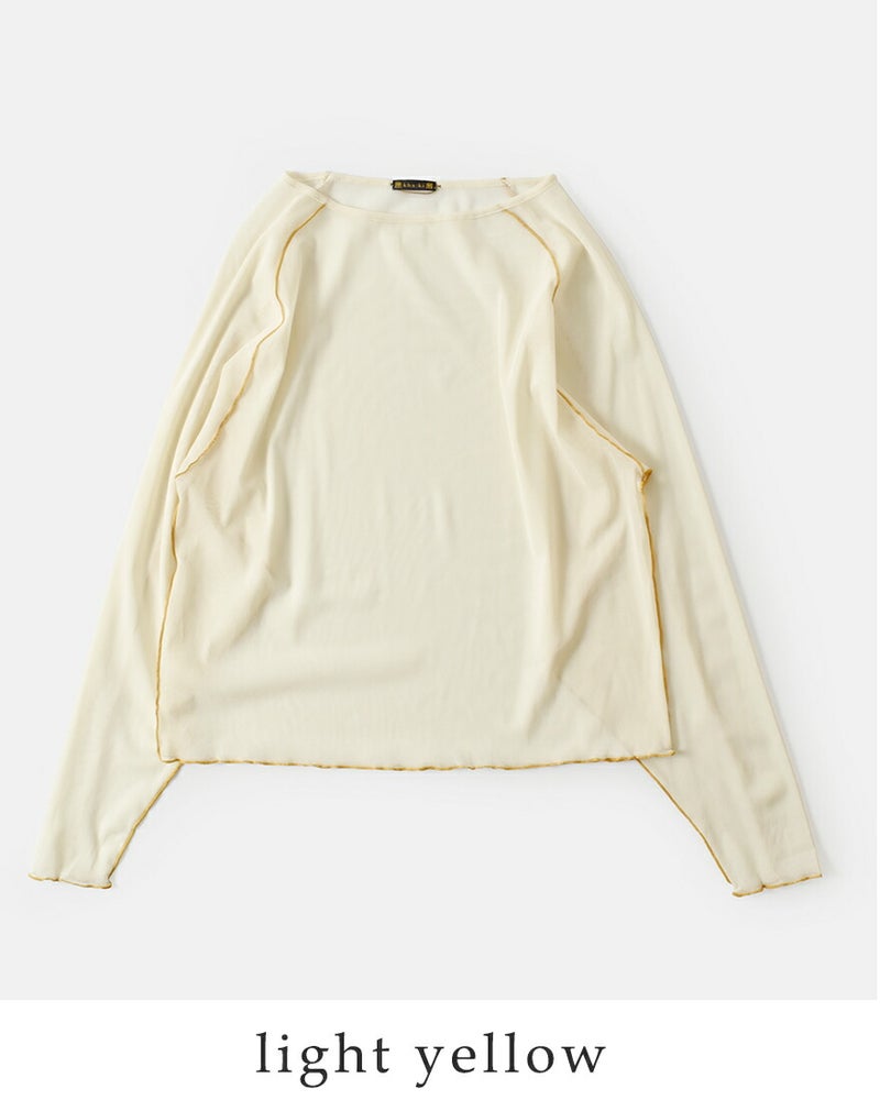 kha:ki(カーキ)よりストレッチパワーネット カラーステッチシアー プルオーバー “COLOR STITCH SHEER TOP”のご紹介です。透け感のあるポリエステルパワーネット素材を使用し、軽やかで伸びの良い着心地が魅力の一枚。程よく体に沿いながらも締め付け感がなく、レイヤードスタイルに自然に馴染みます。各シームには配色糸のメローロックを施し、あえて縫い代を表に出すことで、ミニマルな中にさりげないデザイン性をプラス。舟底型に切り替えたボリュームのある袖は、タンクトップやTシャツなど、合わせるインナー次第で表情が変わります。春夏のレイヤードスタイルに大活躍の一枚です。