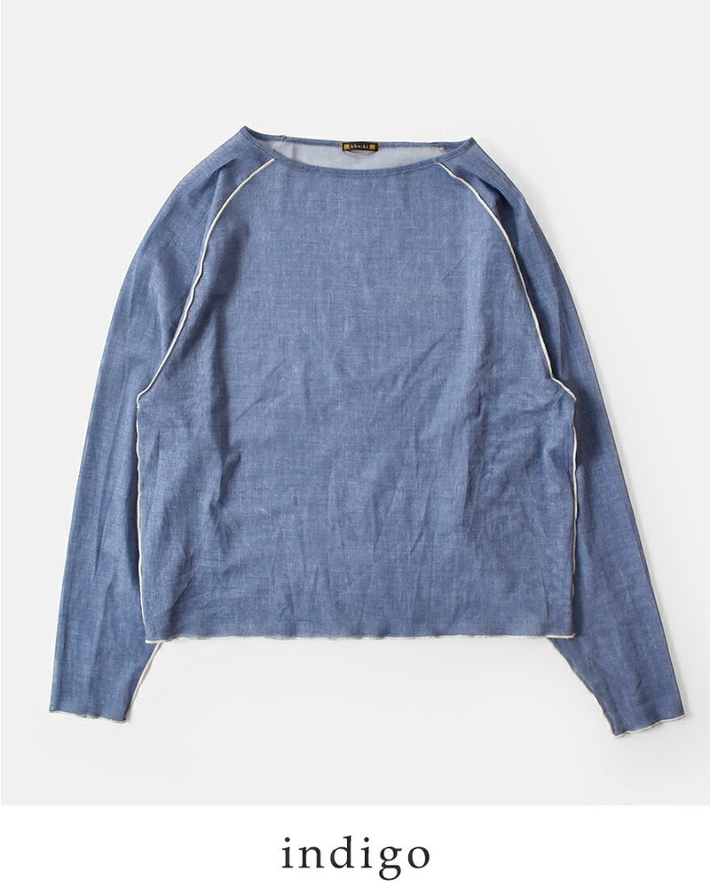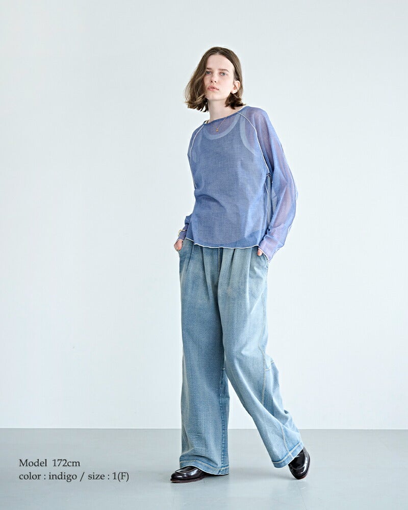 舟底型に切り替えたボリューム感のある袖は様々なインナーとのバランスがとりやすくなっています。 インディゴ色はデニム調のプリントを表面に施しています。