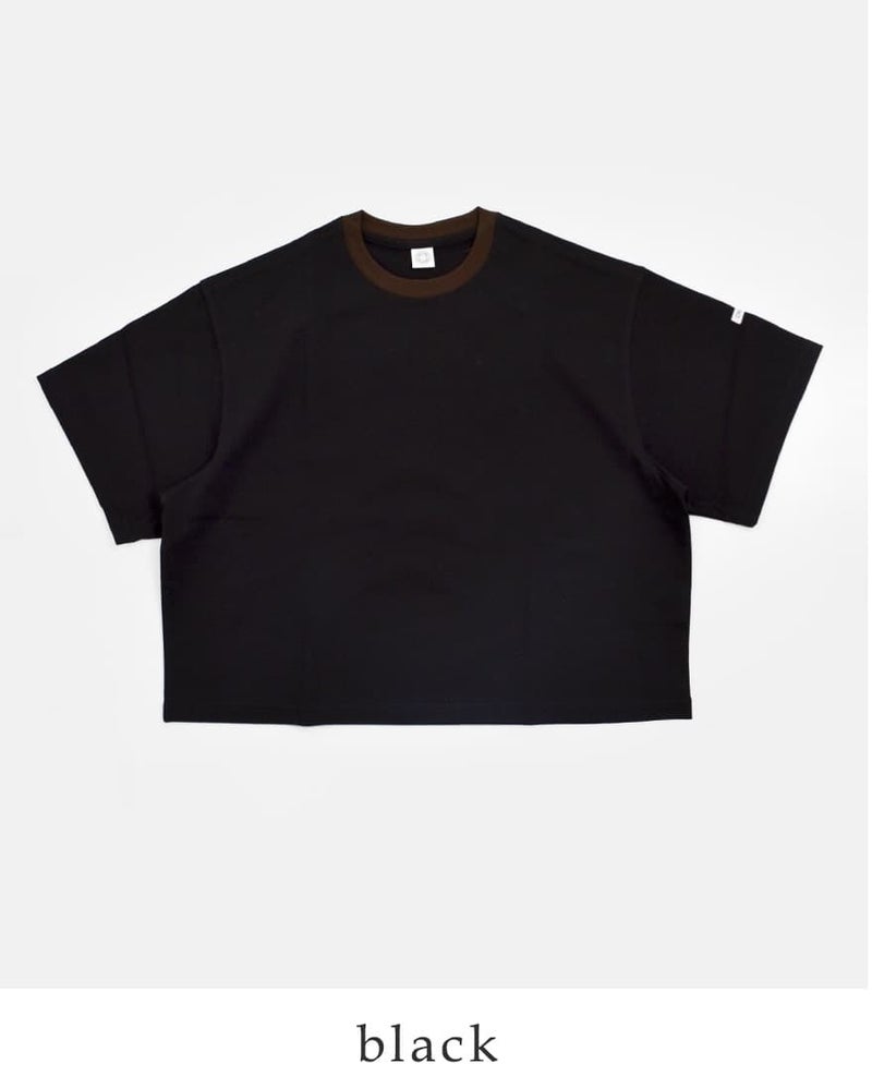 ●配色が効いたリブネック。●すっきりとした五分袖。●裾に配されたネームが、さりげないポイント。●ハリのあるラッセル素材。