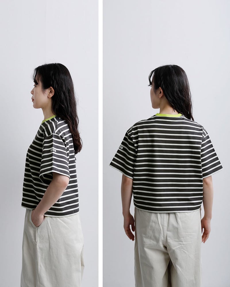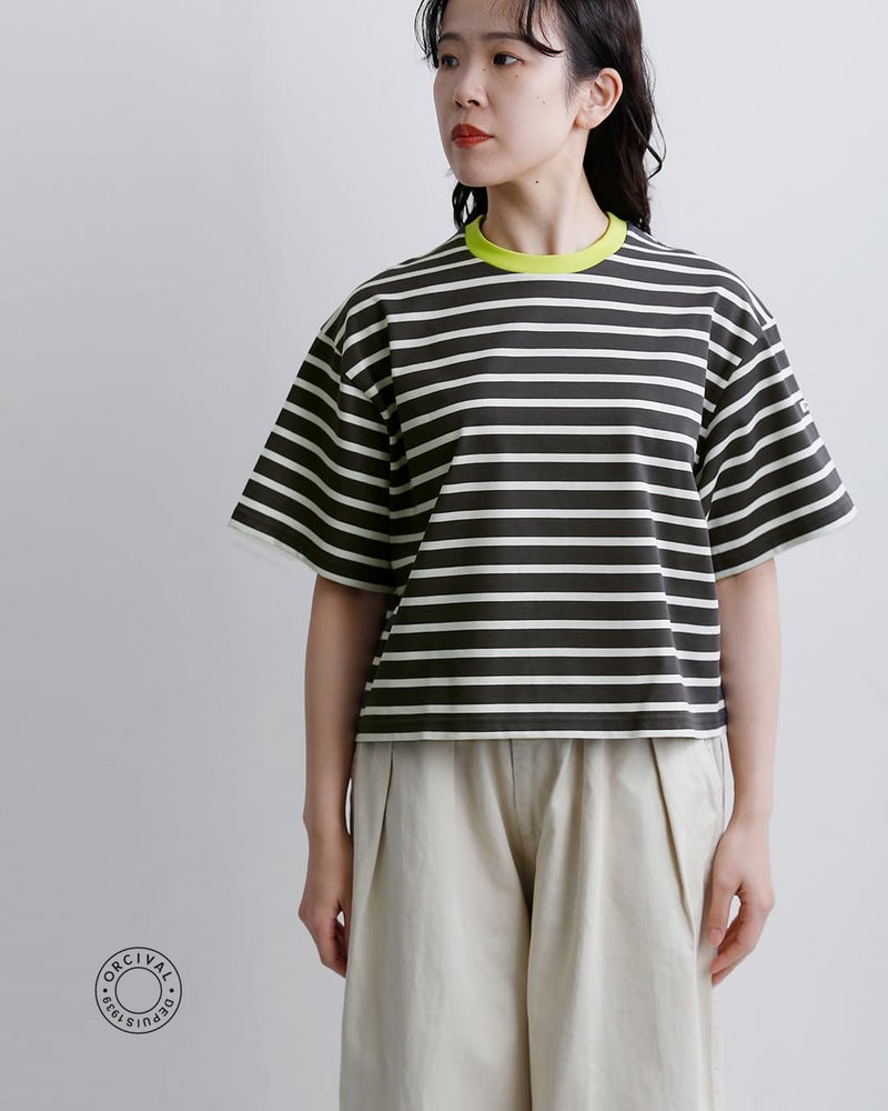 ORCIVAL(オーチバル・オーシバル)より、コットンラッセルボートネック五分袖 Tシャツをご紹介します。定番バスクシャツをベースにした五分袖Tシャツ。ブランドならではのラッセル編みコットンは、ほどよいハリとやわらかさを兼ね備えた着心地。カジュアルすぎず、きれいめにもなじむ絶妙なバランスが魅力です。コンパクトな着丈とゆとりのある身幅が、今の気分にフィット。ワイドパンツやボリュームのあるボトムとも好相性で、自然とバランスの取れたスタイリングに仕上がります。ボーダーは配色の効いたネックがさりげないアクセントに、無地はミニマルで洗練された印象に。それぞれ違った表情を楽しめるのもポイント。一枚でサマになる、日常にちょうどいい一着です。