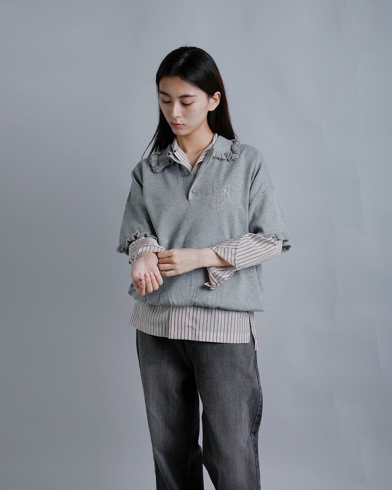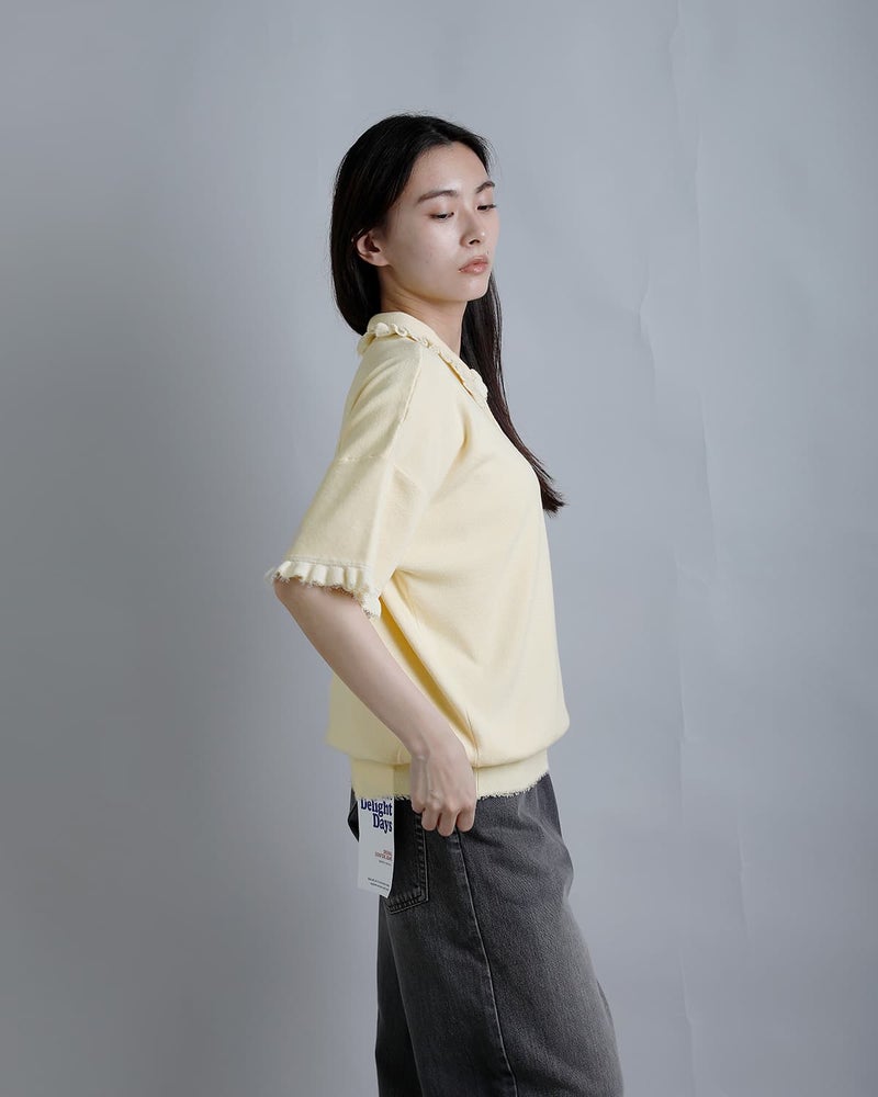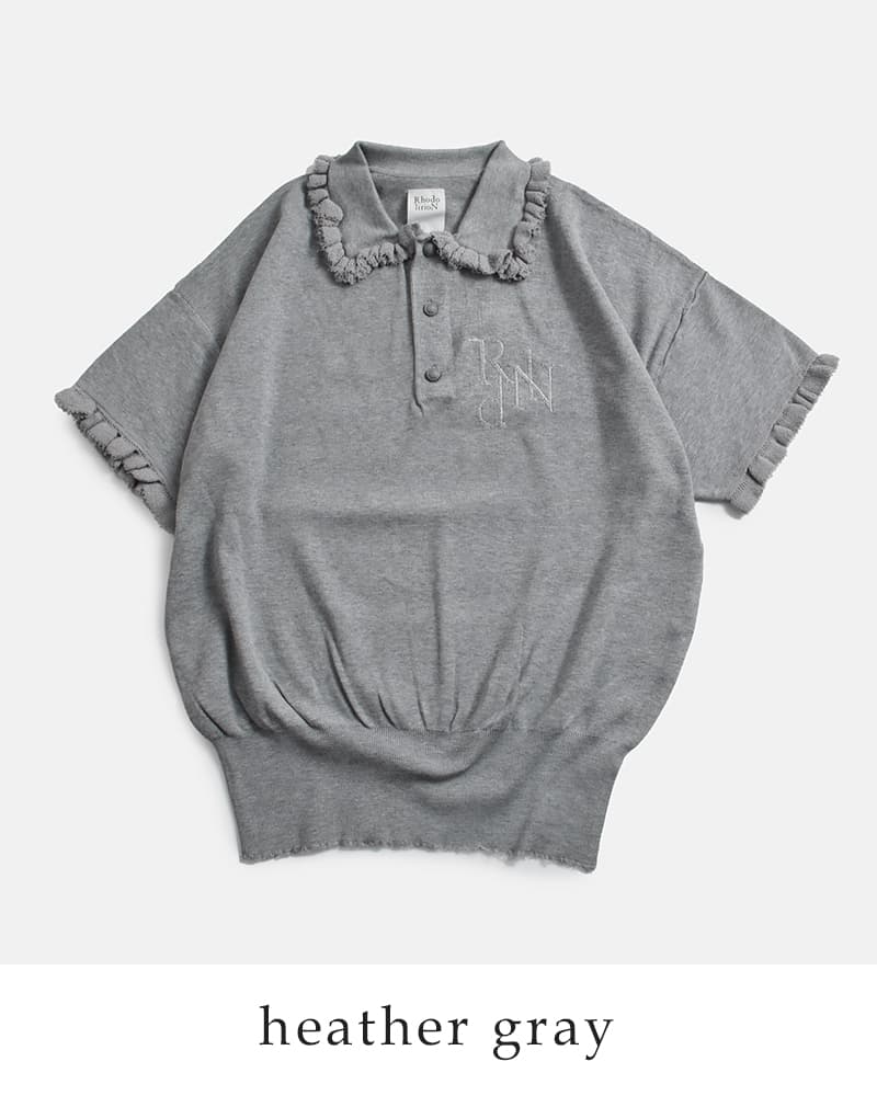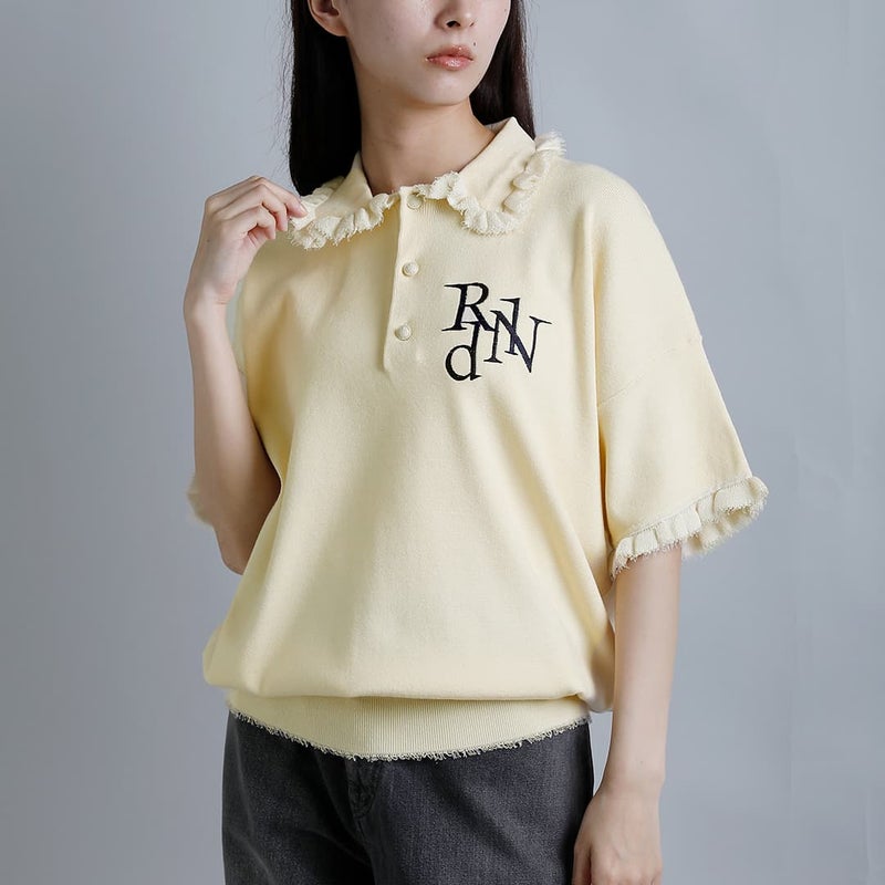 襟と袖周りにフリルをあしらった、スポーティかつ女性らしさを演出するポロセーター。素材に光沢感のあるレーヨンポリエステル糸を使用し、ふっくらとした厚みと軽やかな着心地を実現。程よいストレッチ性と清涼感も魅力です。ボタンにはネイビーブレザーにも使われる紋章柄ボタンを採用し、胸元には”RdlN”のモノグラム刺繍をプラス。ゆったりとしたサイジングで、ユニフォームのようなコンサバティブなスタイリングにも最適。さらりとした肌触りでストレスフリーの着用感です。