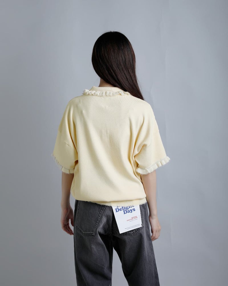 襟にたっぷりとフリルをあしらった、贅沢なディティール。細かな糸が見えるフリンジのフリルで、お顔周りがぱっと華やぎます。