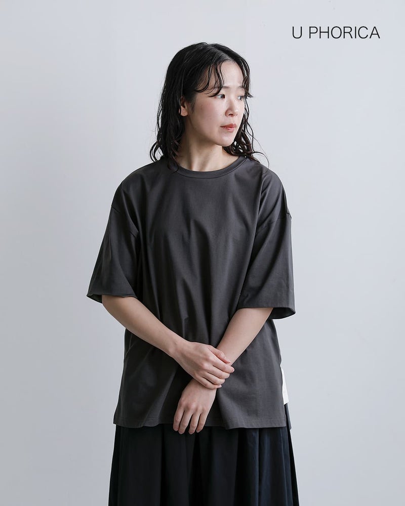 U PHORICA(ユーフォリカ)より、コットンシルケット天竺オーバーサイズ Tシャツのご紹介です。上質なコットン原料を使用した綿100%のシルケット天竺素材に、シルケット加工とバイオ加工を施すことで、しっとりと滑らかな肌あたりと上品な光沢感を備えた生地に仕上げています。程よい肉感のハイゲージ素材で透けにくく、ヒップにかかる前後差のある着丈とゆとりのあるシルエットが特徴。袖裏には布帛生地をあしらい、折り返した際に異素材のコントラストが映える、シンプルながらも存在感のある一枚です。