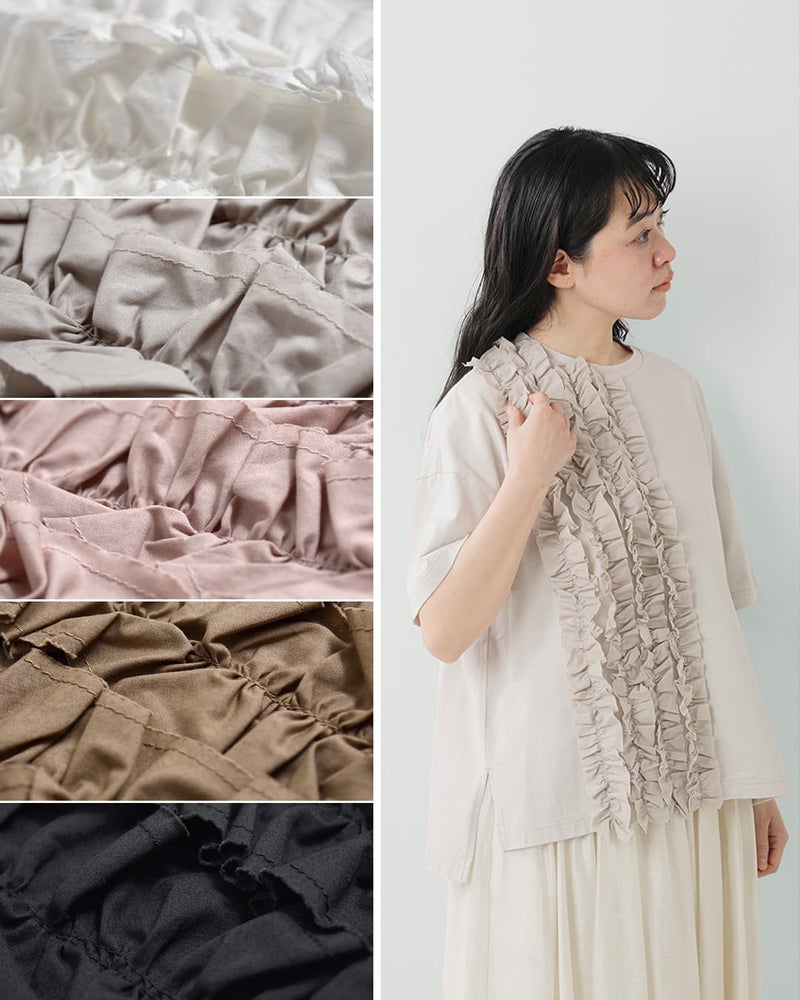 フロントに施されたフリルが、スタイリングのアクセントに。甘すぎず、大人が取り入れやすいバランス。フリルにはナチュラルなタイプライター生地を使用し、さりげない立体感と軽やかさをプラス。