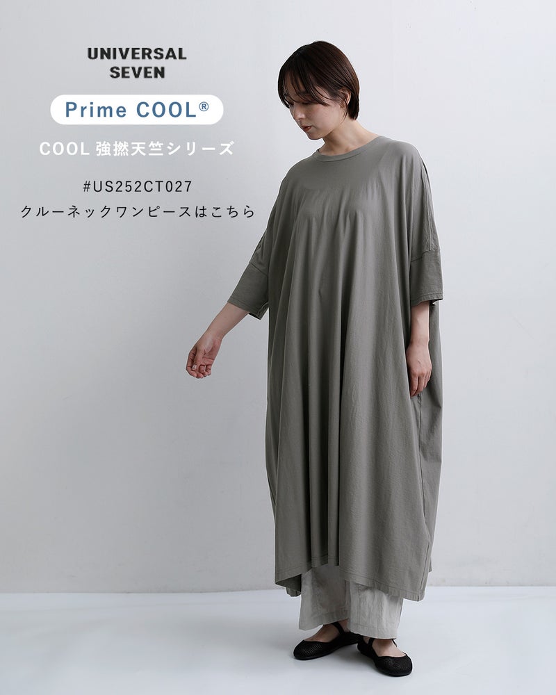 universal seven(ユニヴァーサルセブン)より、COOL強撚天竺 BIGスリーブ Tシャツのご紹介です。シャリ感の接触冷感素材(Prime COOL?)は、肌に触れた瞬間にひんやりと感じる夏に最適な素材です。肌離れがよく、着た瞬間にひんやりとした感触が広がります。肘が隠れるビッグスリーブで腕まわりも涼しくカバー。ゆったりとしたシルエットは体型を選ばず、カジュアルにもキレイメにも合わせやすいTシャツです。