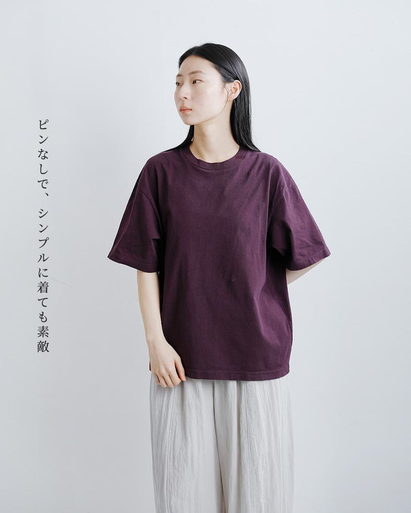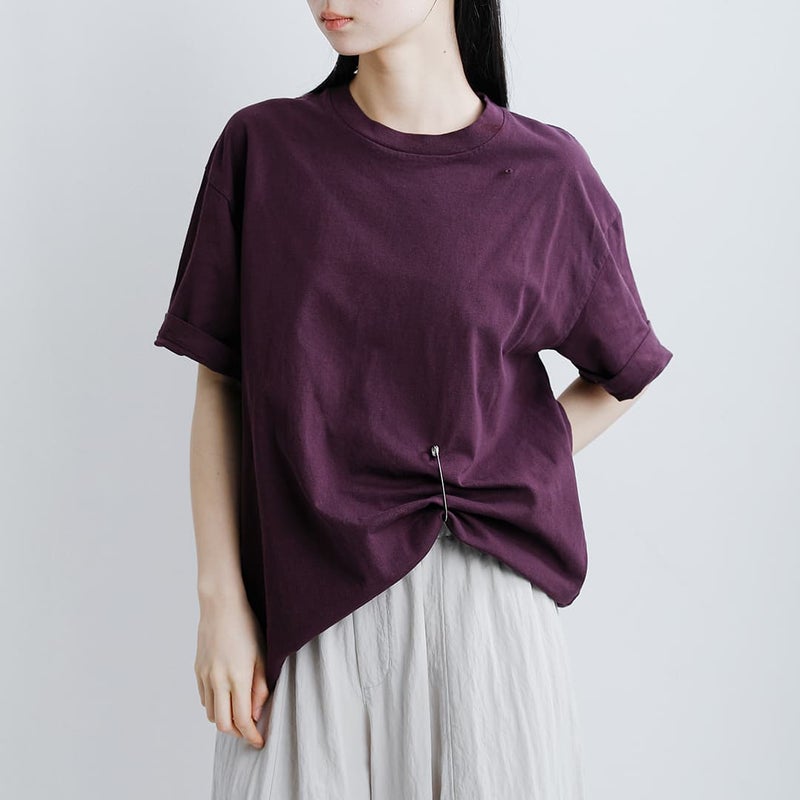 unfil(アンフィル)より、コットンリラックスフィット Tシャツをご紹介します。ゆったりとしたボックスシルエットのTシャツ。付属のキルトピンを付けて、ギャザーを作り、シルエットに変化を付けて着ることが出来ます。生地は製品染めでヴィンテージ感のある雰囲気に仕上げています。インド産超長綿の空紡糸を使用しているため、製品染めの加工後にも毛羽立ちの少ない上質な綿の風合いに仕上がっています。ピンなしで着ることもでき、その日の気分でお好きなコーディネートを楽しめます。