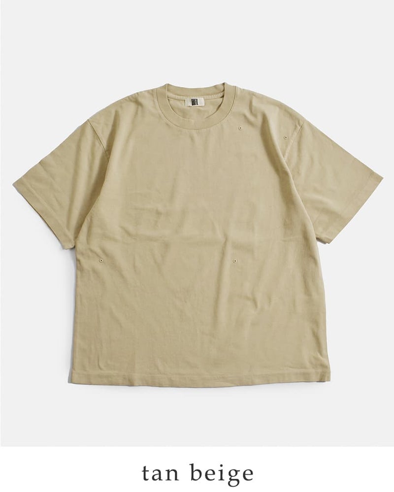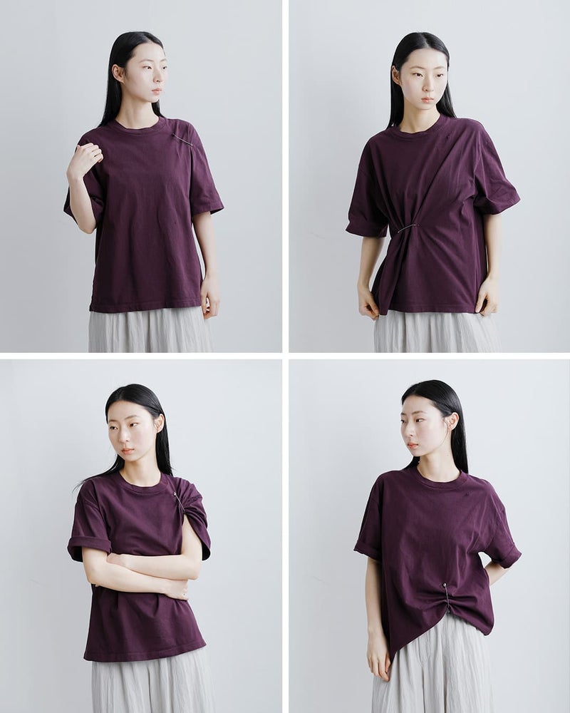 先シーズンから展開しているTシャツに、今期はオリジナルのキルトピンを1つ付けています。4ヶ所空いたアイレットにピンをつけてアレンジした着こなしが楽しめます。