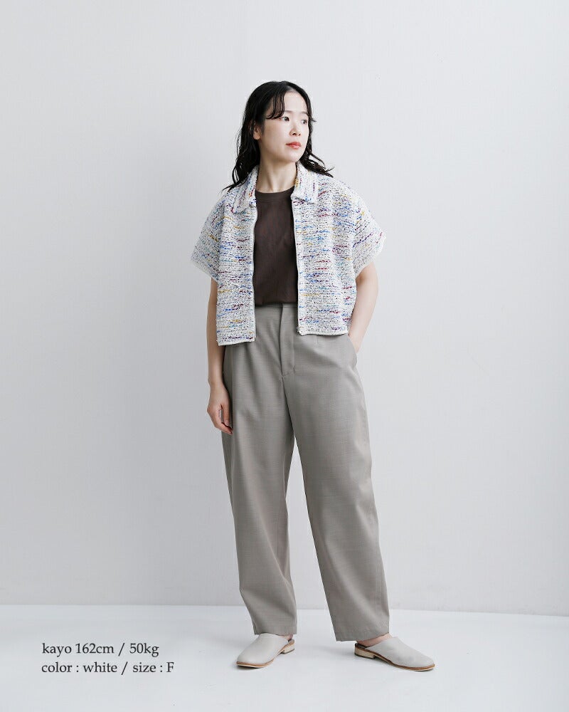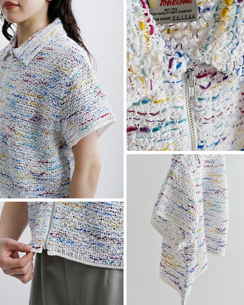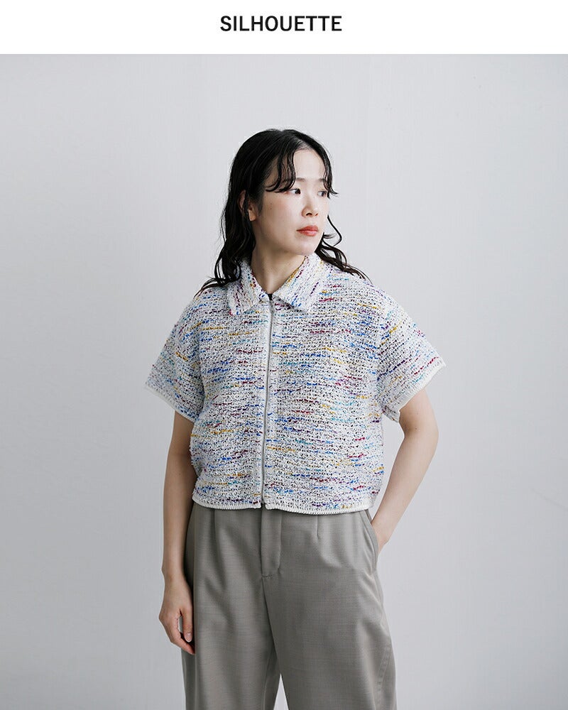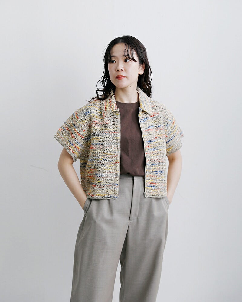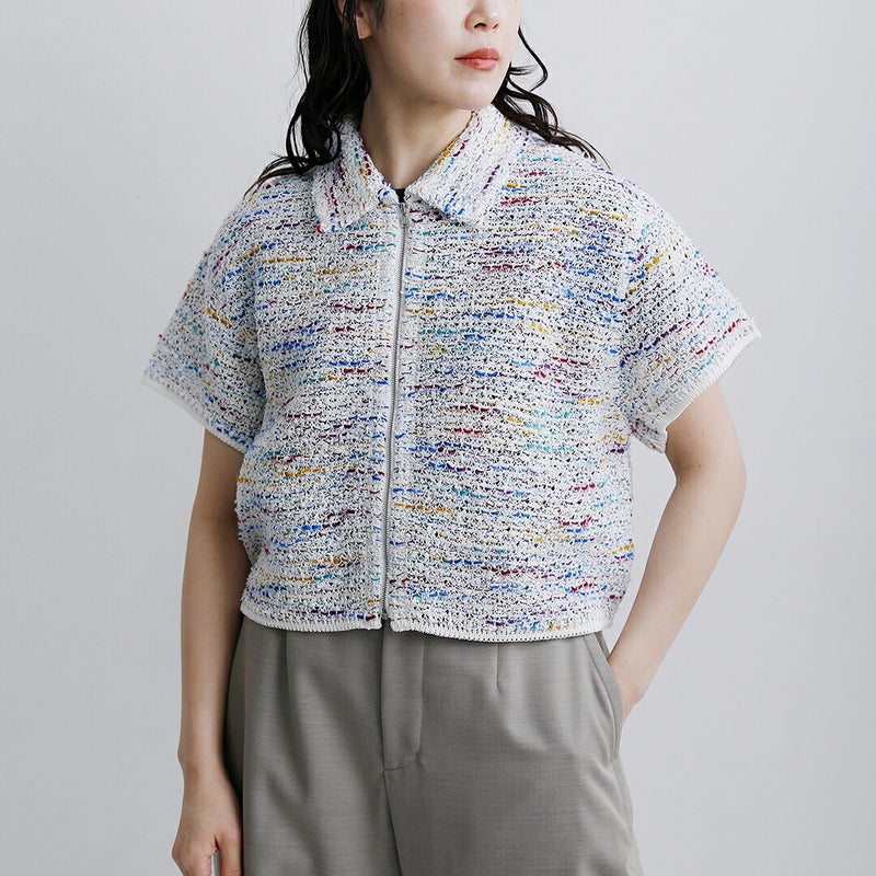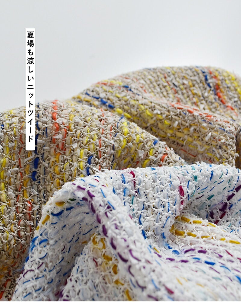 マルチカラーのファンシーヤーン(意匠糸)を使用した、ニットツイード。緩く編まれたニットツイードは軽くて通気性が良く、夏場も涼しく快適に着ていただけます。自宅での手洗いが可能で、お手入れのしやすさもポイントです。