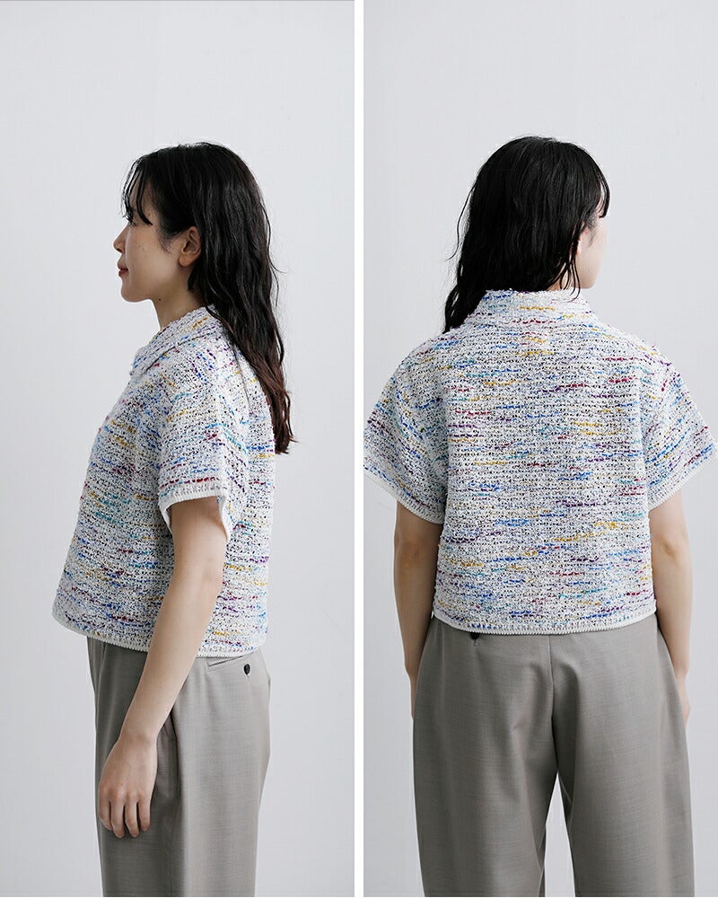 鮮やかなファンシーヤーンが全体に散りばめられ、明るく美しい、ポップなデザイン。お袖は涼しいショートスリーブです。