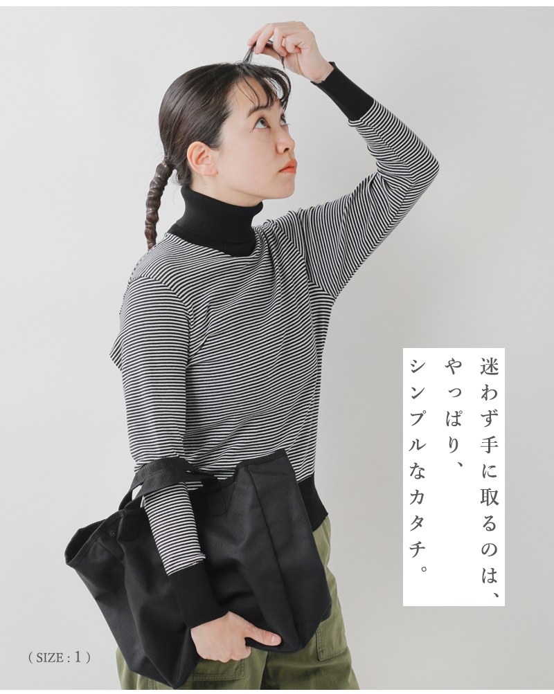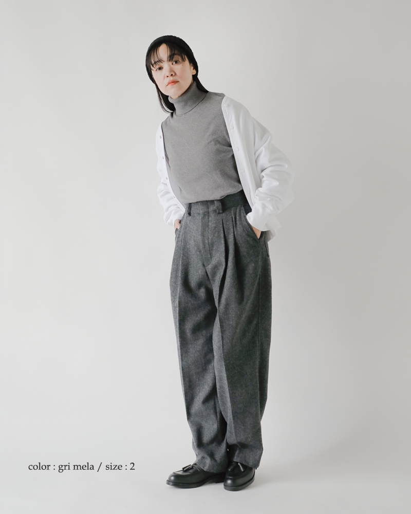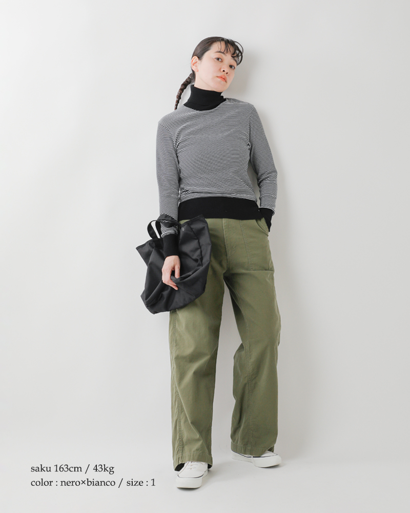 襟はタートルネックですが、2×2のシングルリブ仕様で全く締め付け感がありません。クシュッとさせたり、きちんと折り曲げたりと、その日のスタイリングやお好みで、アレンジをお楽しみいただけます。チクチク感もなく快適です。