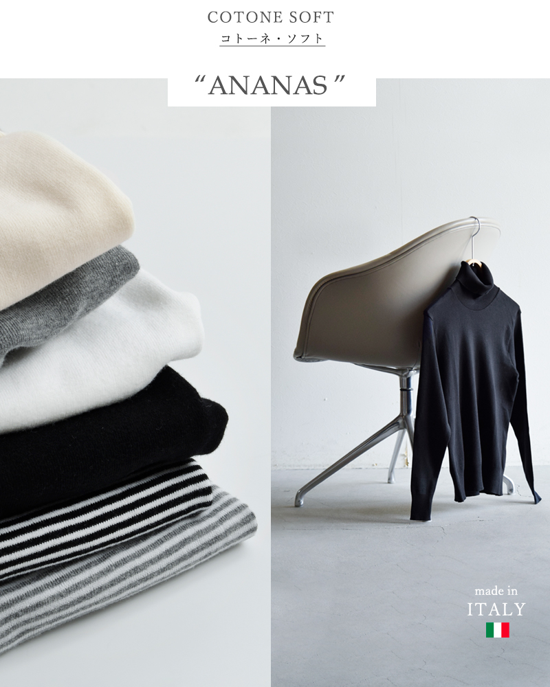イタリアの老舗アンダーウェアブランド GICIPI(ジチピ)より、コトーネソフトコットンリブタートルネックプルオーバー“ANANAS” のご紹介です。袖口や裾のリブがハイゲージニットのような上品さのあるコットン100%のタートルニットカットソー。ベーシックでシンプルなデザインなのでジャケットやカーディガンとのコーディネート等、デイリーに幅広く使えます。いつものスタイリングに取り入れやすいベーシックな色展開に加え、落ち着いたカラーリングの細ボーダーも仲間に加わりました♪