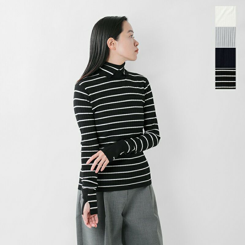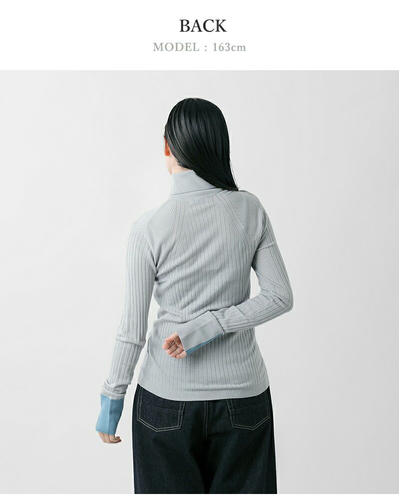 襟のようなディテールのタートルネックがポイント。また袖口を配色仕様にしたデザイン性のある一枚です。