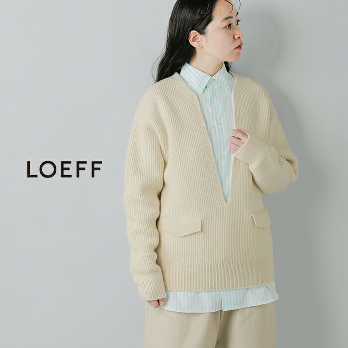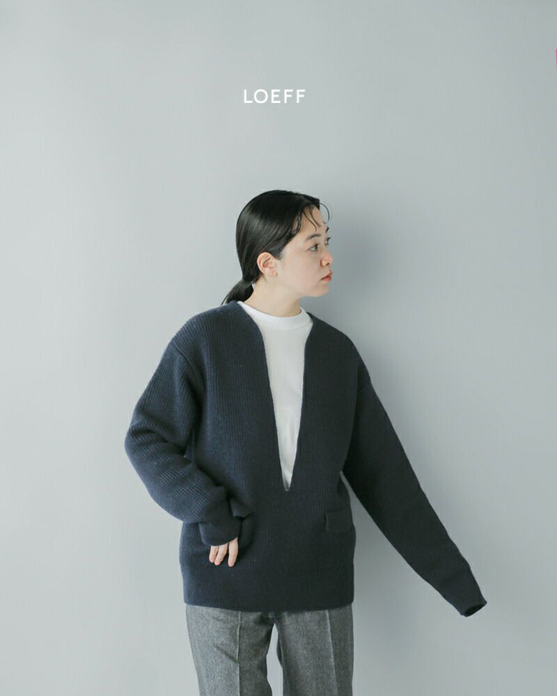 LOEFF(ロエフ)より、ウールヤーン畔編スリットネックプルオーバーのご紹介です。ふくらみのあるウールヤーンを超度詰めで畔編みにしたセーターで、ヴィンテージ感もありつつ、がっしりとした風合いが魅力。編み続きの胸元の深いスリットと、フラップポケットがポイントの一枚です。