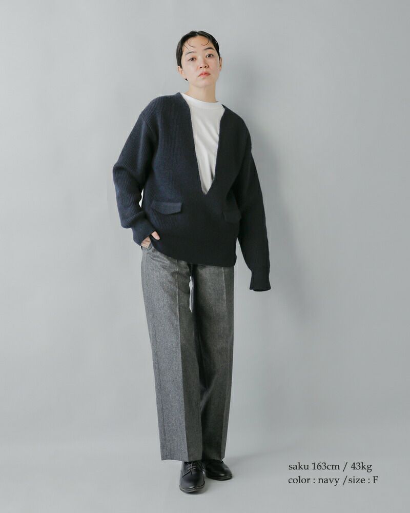 ゆったりとしたボディに、深く開いたVネックが印象的なニットプルオーバー。洗練されたストンとしたシルエットと直線的なラインが、ミニマルな雰囲気を演出します。レイヤード次第で、さまざまな表情の着こなしが楽しめます。