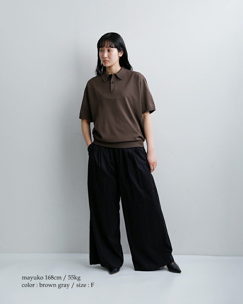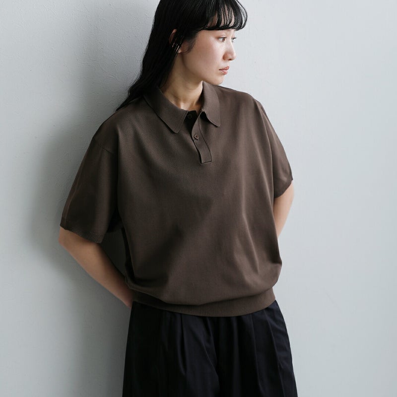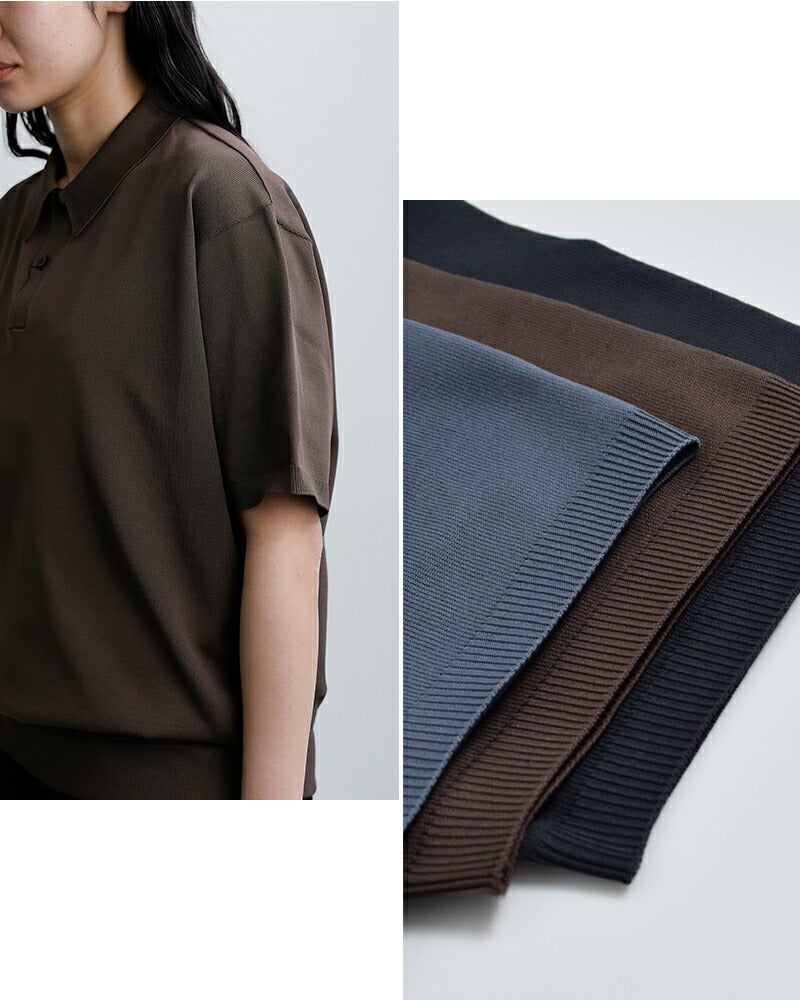 端正なポロカラーが印象的なネックラインは、シンプルながらも洗練された佇まいを演出。程よくコンパクトに設計された襟元とミニマルな前立てが、落ち着いた上品さを際立たせます。