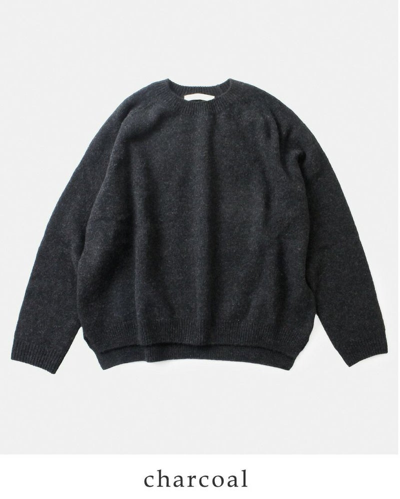 メリノウールと、毛がしなやかで肌に触れて心地よいブルーフォックスをブレンドした素材。綿の状態で染色を施しているため、ナチュラルで味わい深い色合いに。編地の表面には柔らかな毛羽が立ち、ずっと触れていたくなるほど軽く柔らかなニットです。