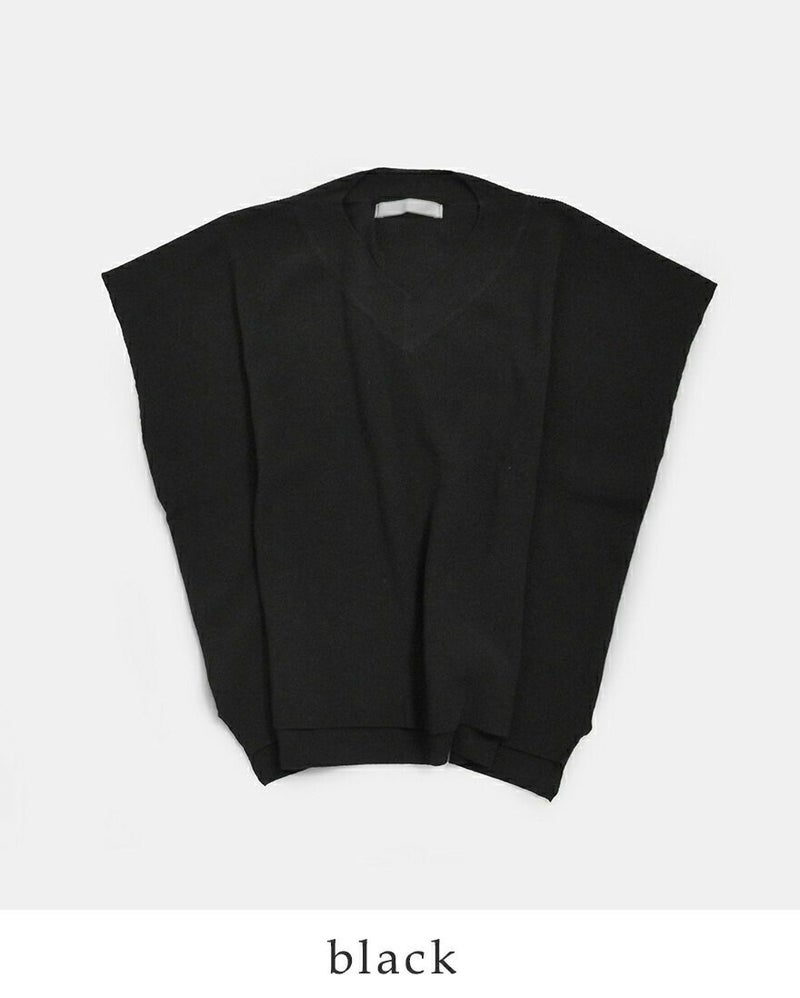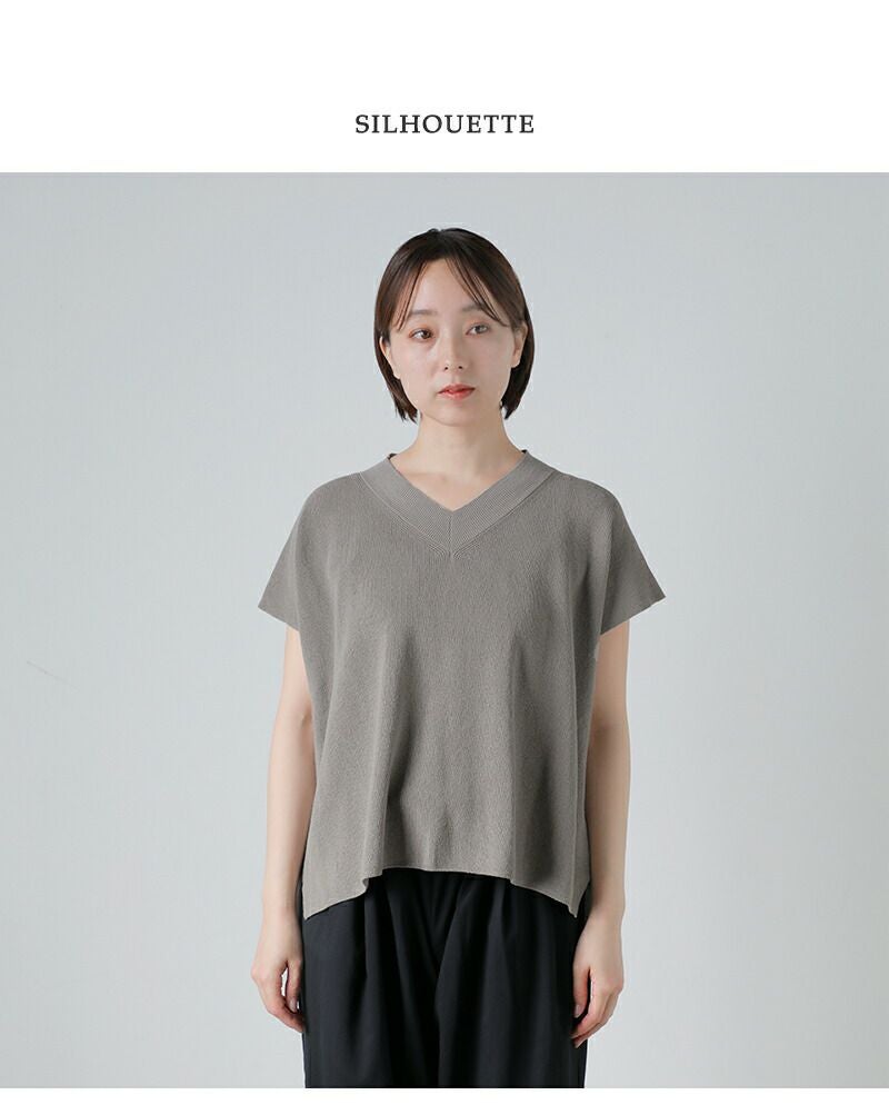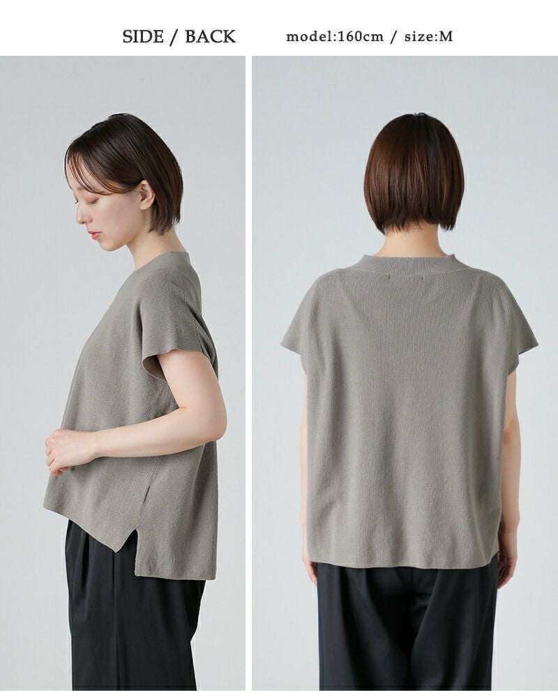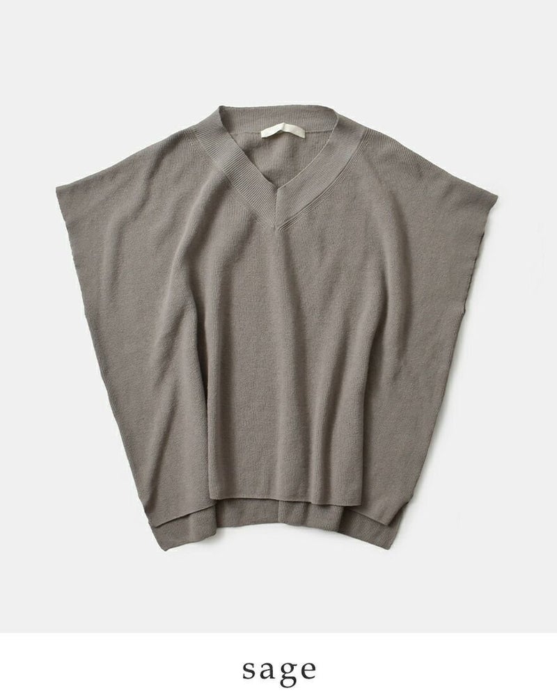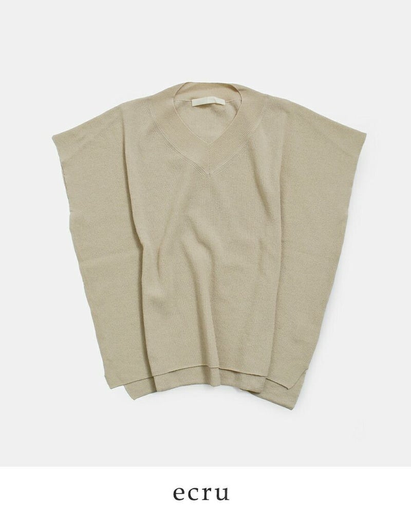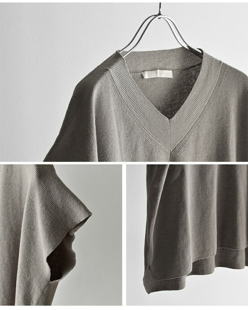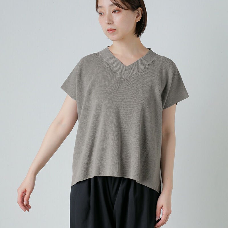 太めリブのVネックが首元をすっきりと見せ、上品な抜け感を演出します。裾は前後差のあるデザインで、サイドスリットが動きに軽やかさを添えてくれます。