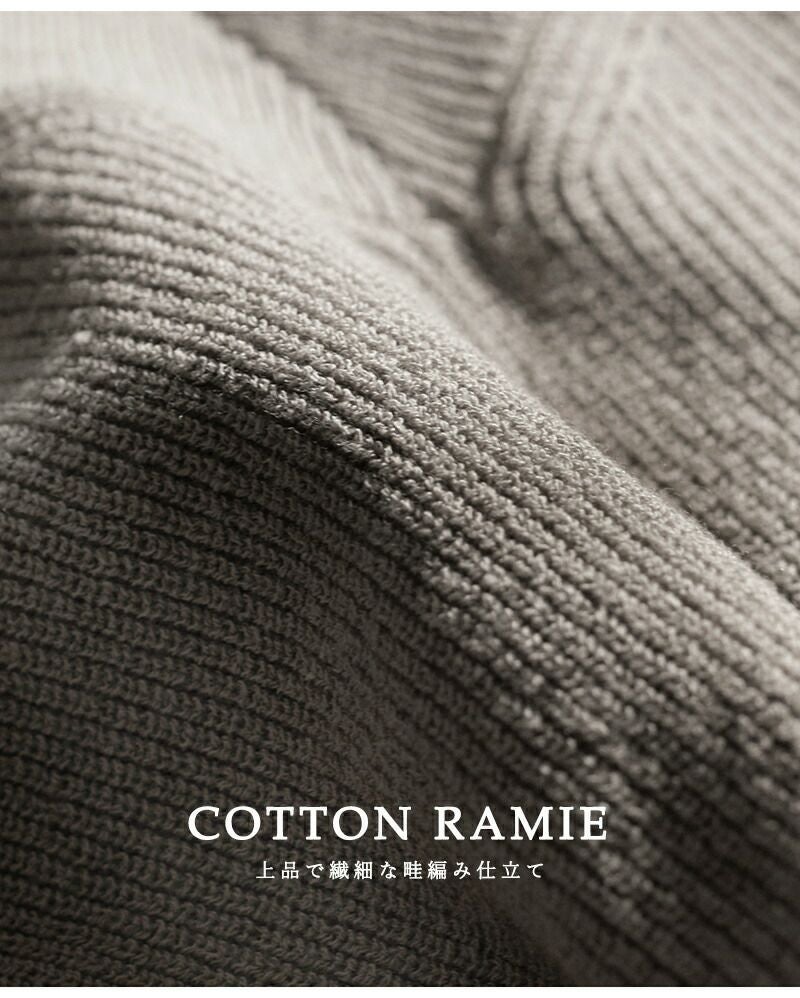 コットンの柔らかさに、ラミー特有のほのかな光沢とドライな質感を掛け合わせた畦編み仕立て。凹凸のある編み地がさりげない立体感を生み、肌離れの良いさらりとした着心地と、奥行きのある表情を両立します。