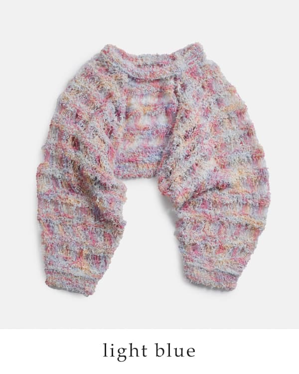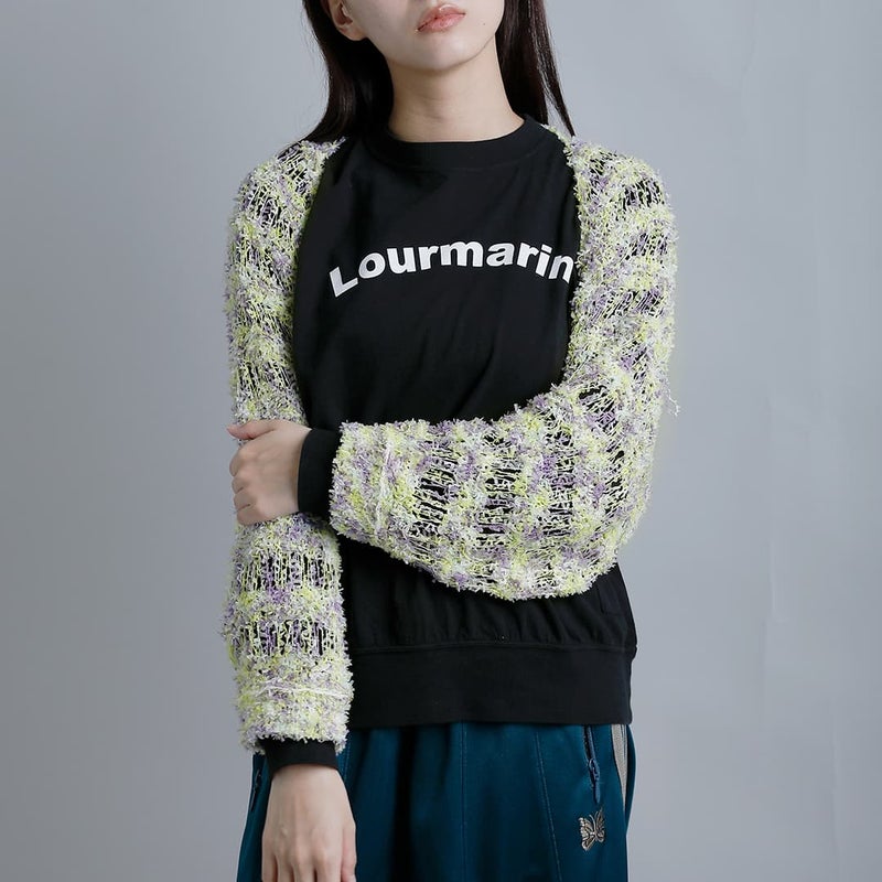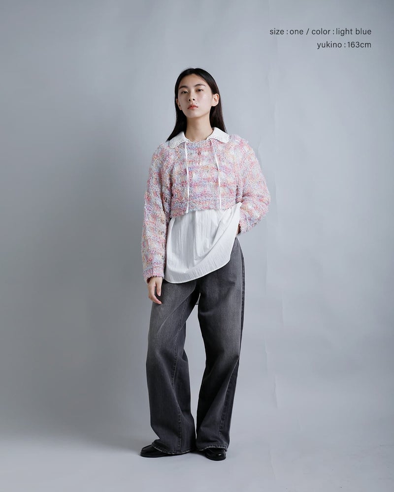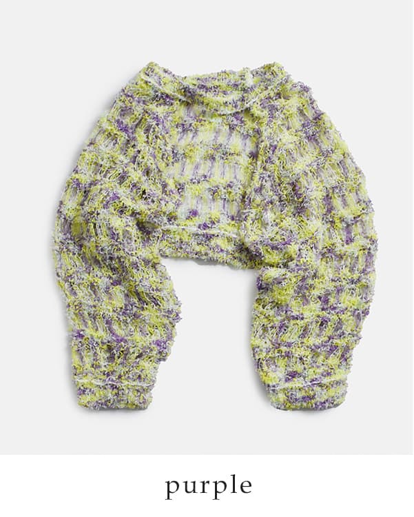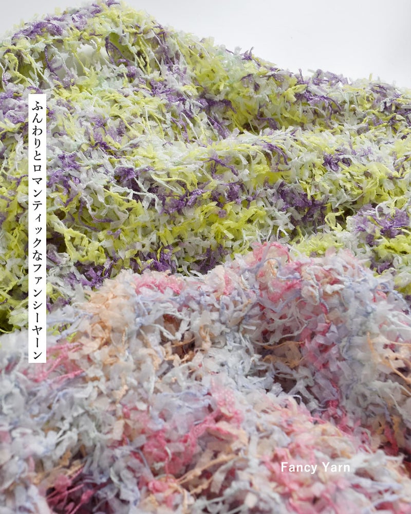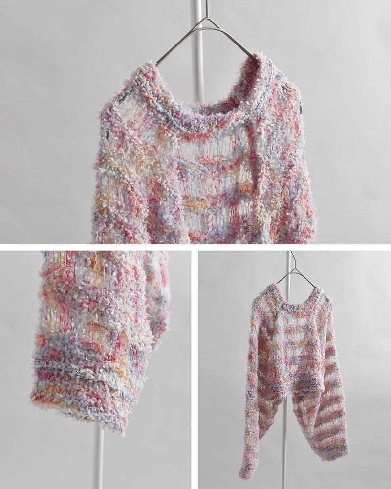 彩りの美しいファンシーヤーン。ふわりとゆるく編まれた、ヴィンテージ感のある仕上がり。風を通し、涼しく快適な着心地で、春夏のニットスタイルにぴったりです。