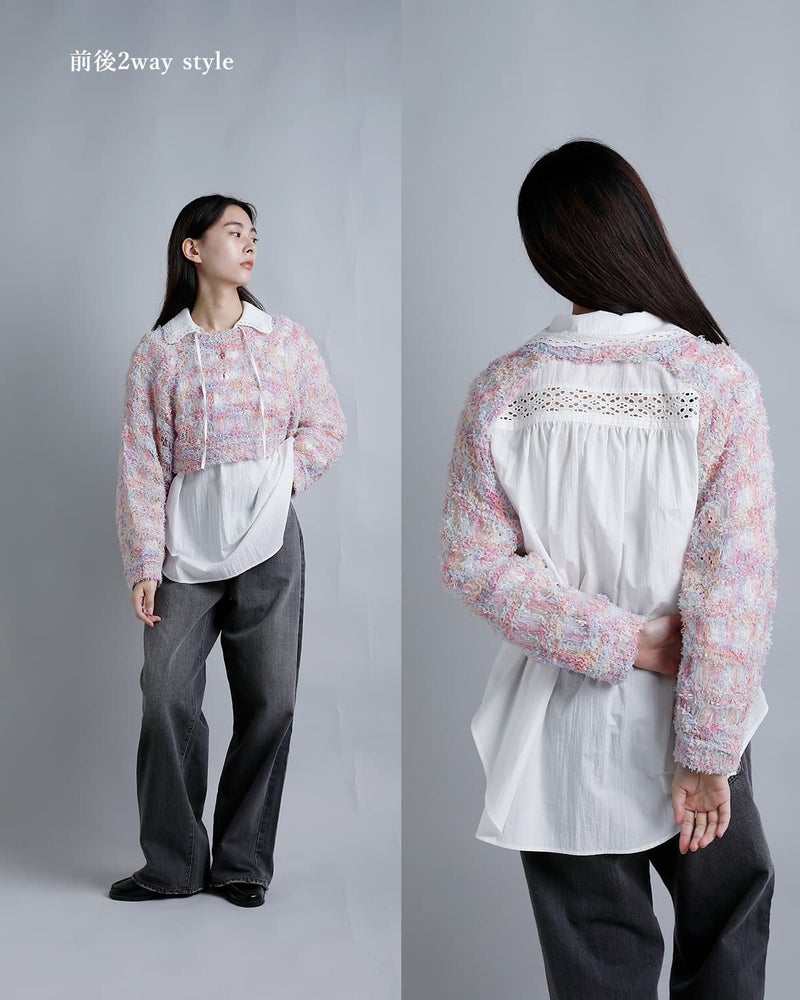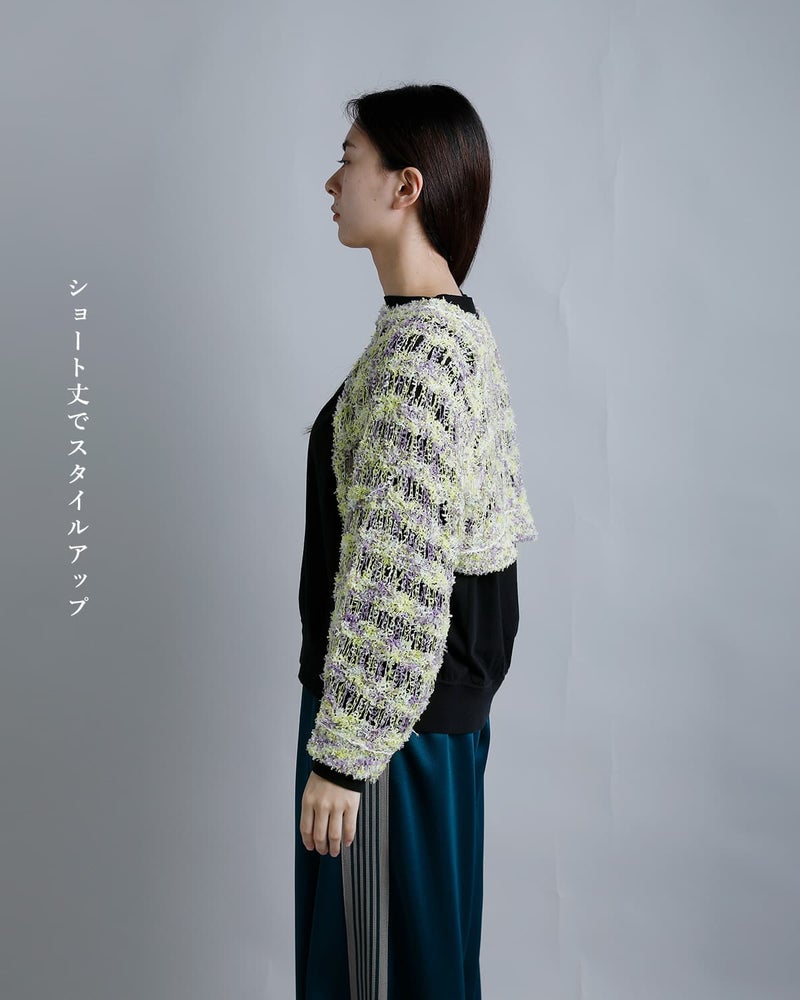 RHODOLIRION(ロドリリオン)より、ファンシーヤーン ニットボレロ をご紹介します。色や太さの異なる複数の糸を組み合わせたファンシーヤーンを使用したニットベストです。見た目がユニークで可愛らしい糸の表情が、ヴィンテージライクな印象です。袖ボレロタイプで前後どちらでも着て頂けるデザインとなります。