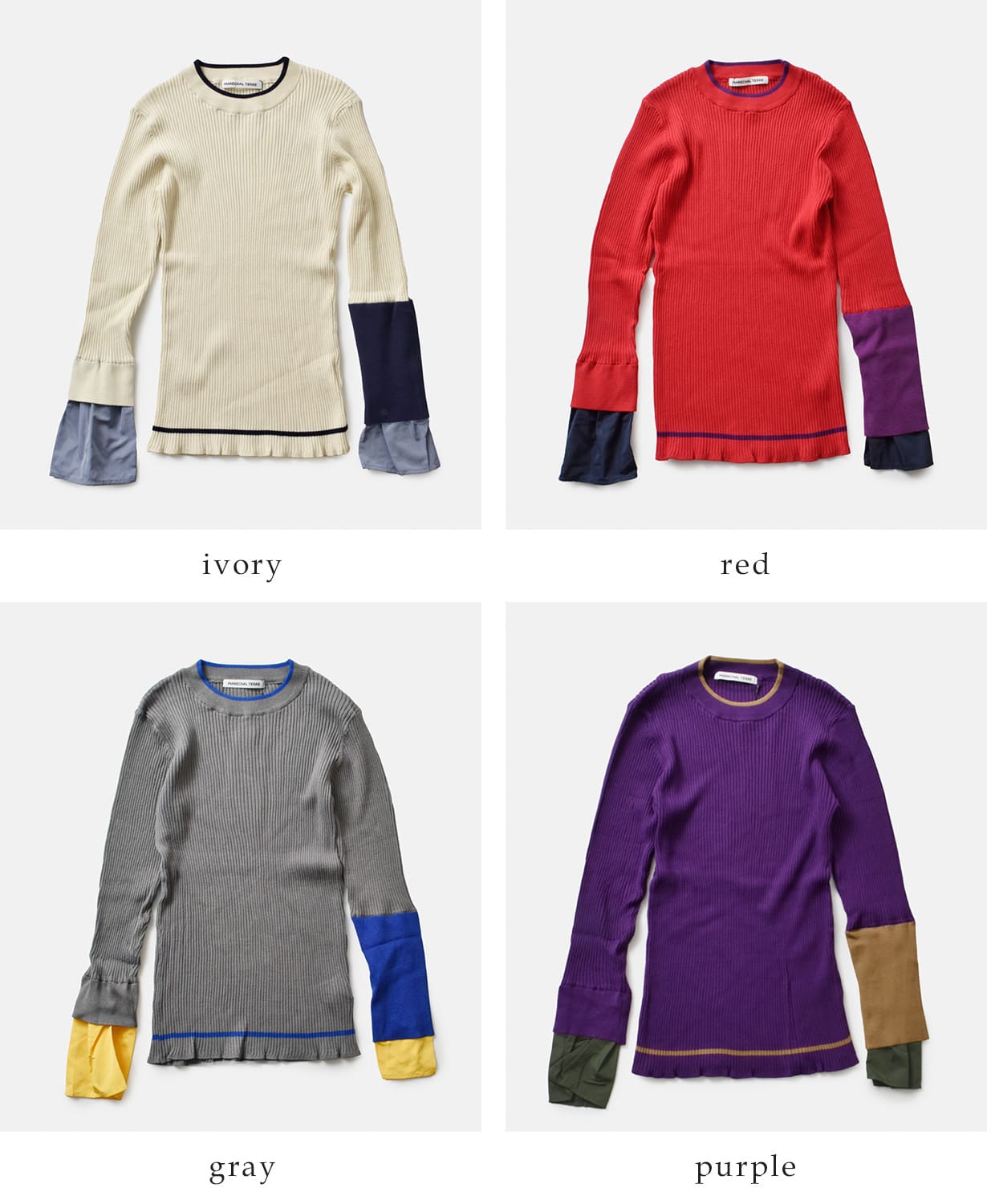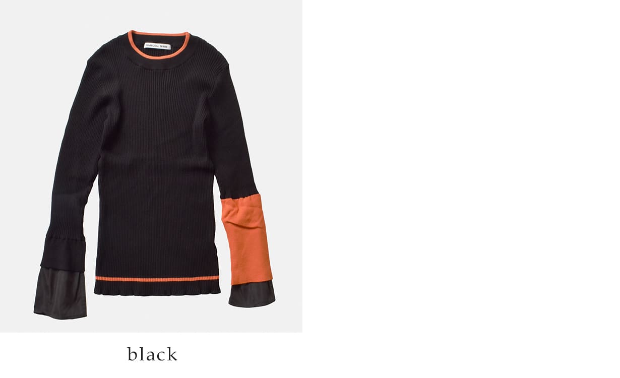 長めの袖丈で、布帛でレイヤードにした袖口。左袖にアクセントカラーを配置したアシンメトリーデザインです。