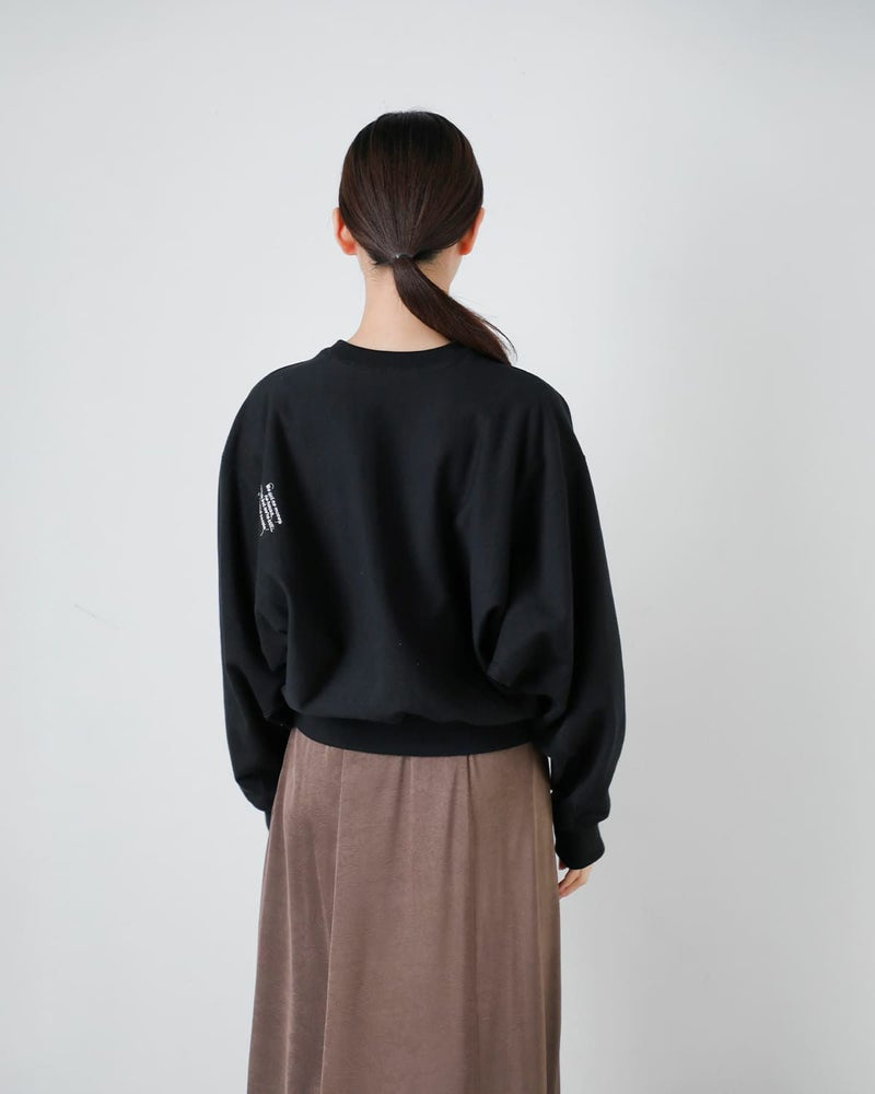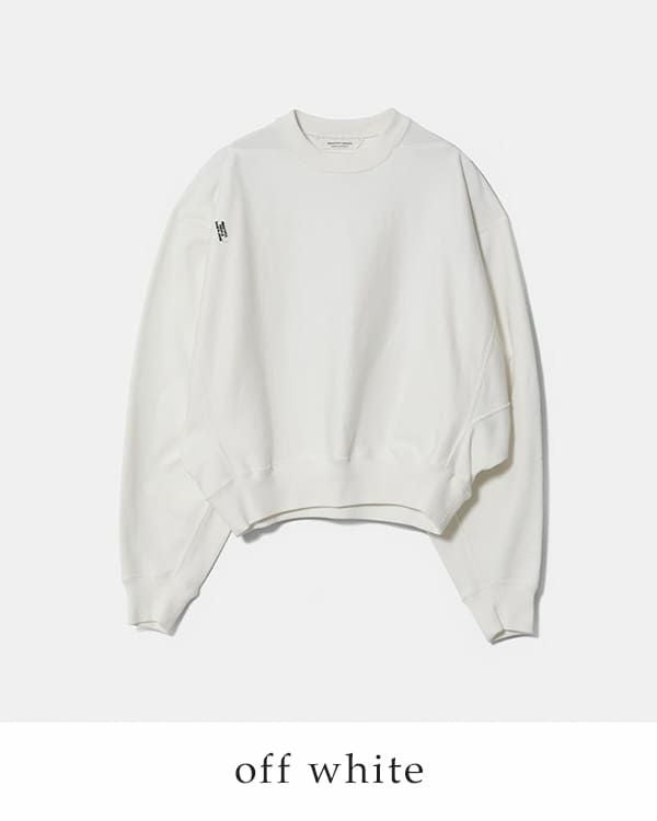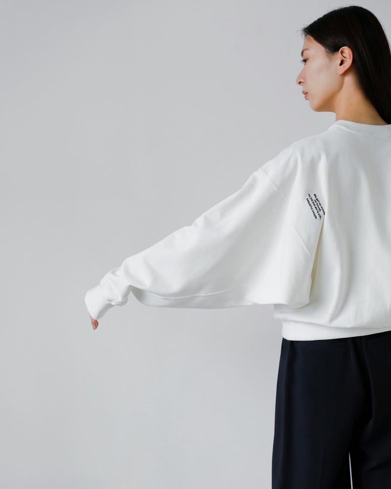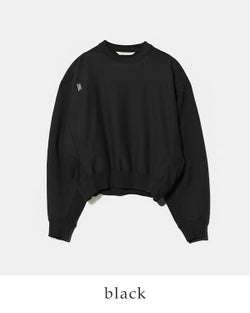 クルーネック仕様。縫い目の無い肩と衿元のクサビから成るボリューム袖が独特のパターンメイキング。
