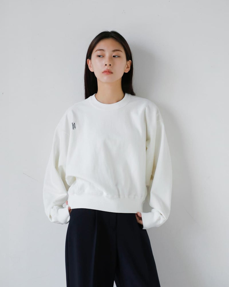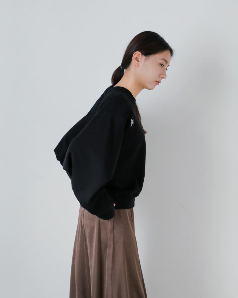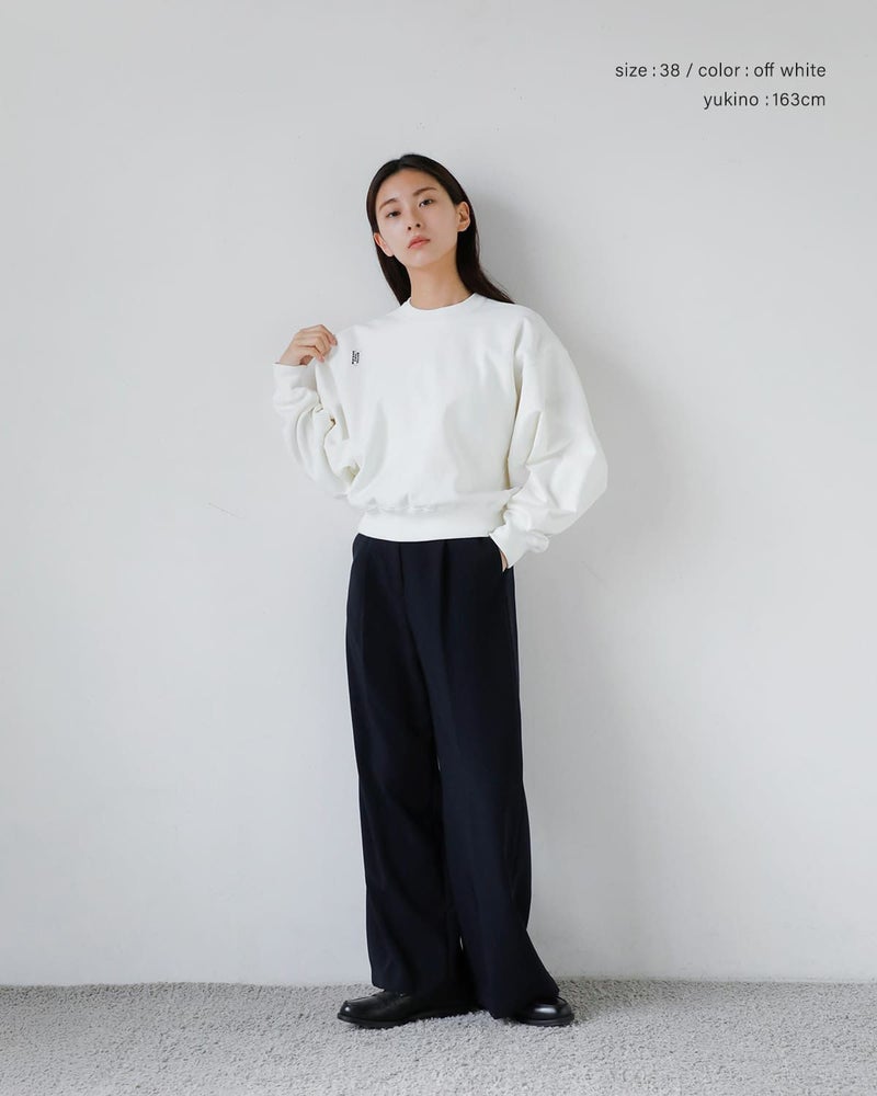 また裏面はパイル仕様の裏毛素材。適度な厚みを感じさせつつ、肌あたりはやわらかく、日常使いしやすい快適な着心地が魅力。見た目のクリーンさと、スウェットならではのリラックス感を両立した一枚です。